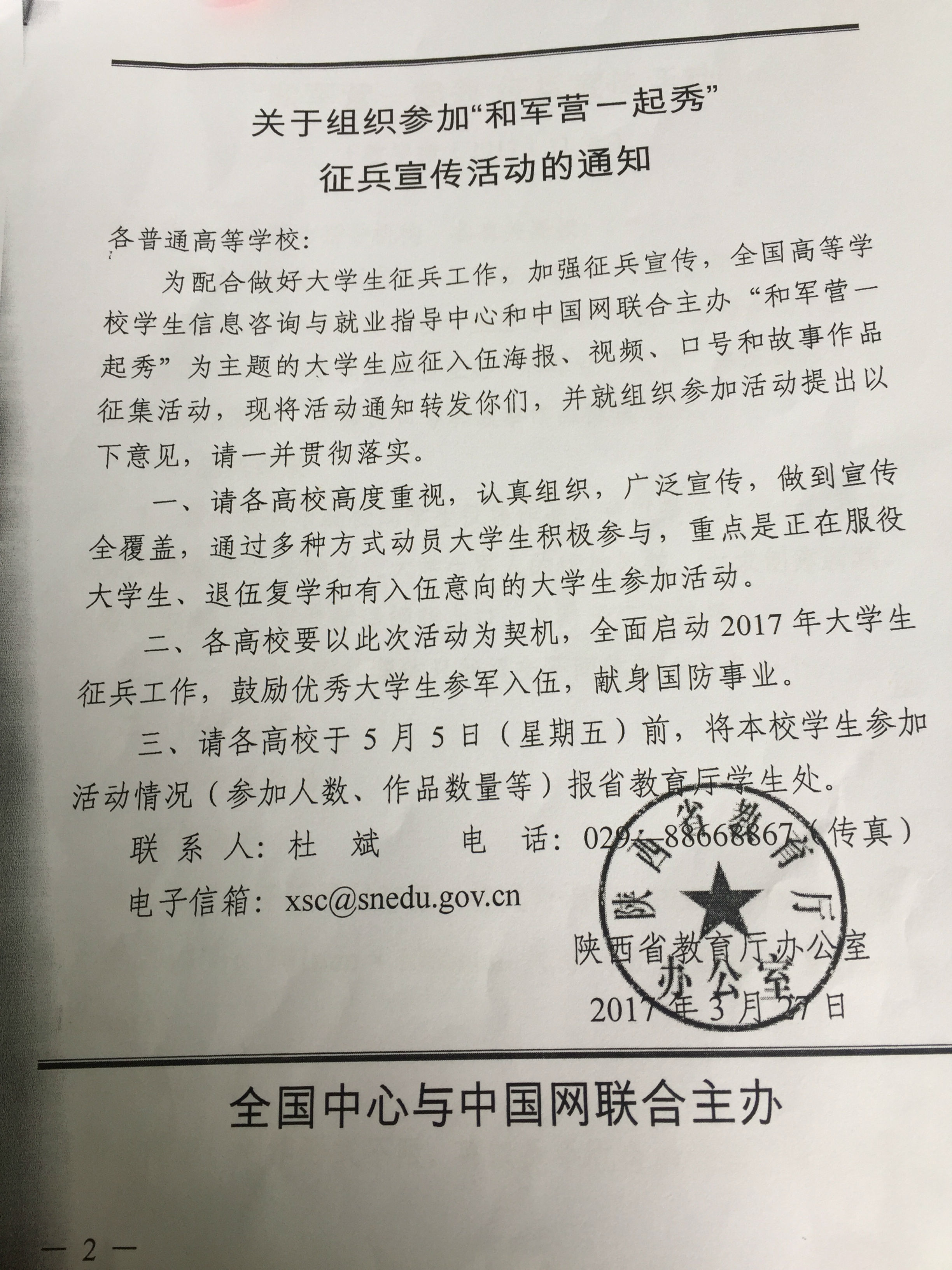 附:关于组织参加“和军营一起秀”征兵宣传活动的通知(复印件一份)