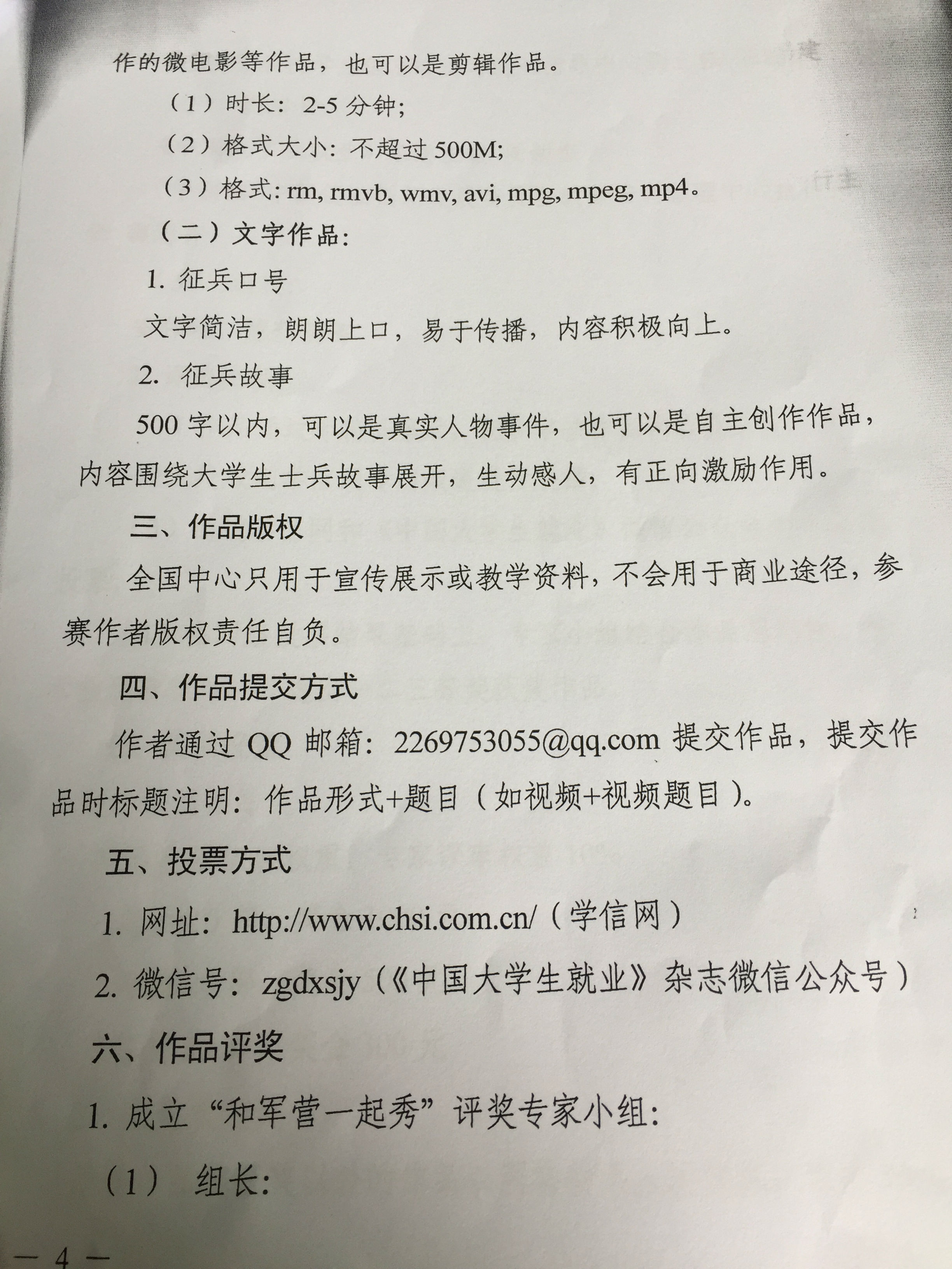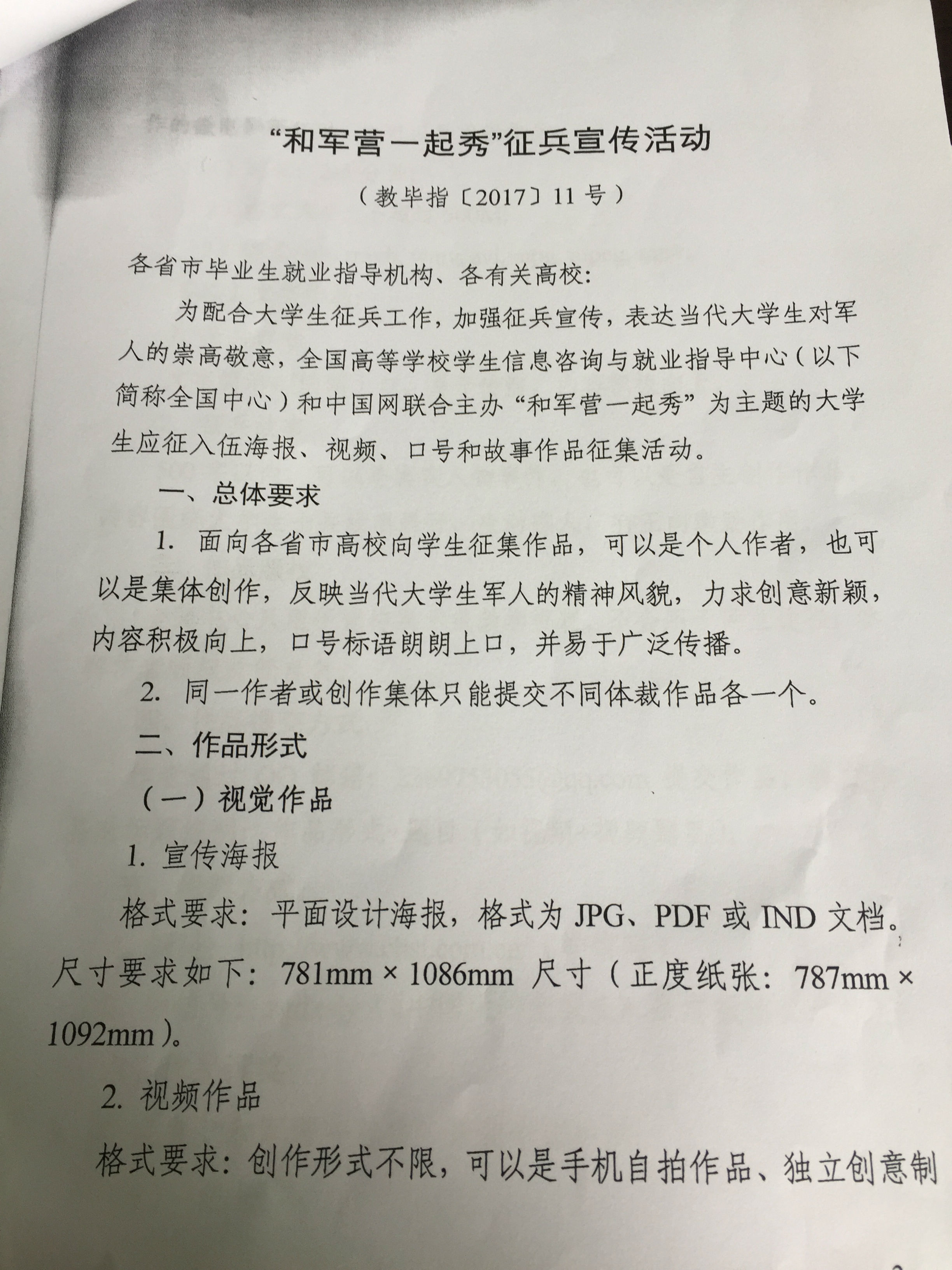 依据陕西省教育厅2017年3月27日文件通知及院领导批示精神,为配合做好大学生征兵工作,加强征兵宣传,全国高等学校学生信息咨询与就业指导中心和中国网联合主办“和军营一起秀”为主题的大学生应征入伍海报、视频、口号和故事作品征集活动。为了搞好我院“和军营一起秀”征兵宣传活动: