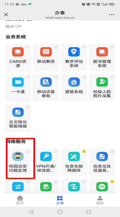 微信端:打开微信,在通讯录“我的企业及企业联系人”搜索“今年会官网”进入,点击“融合门户”选项,进入菜单栏登录账号,打开“办事”栏目,在“网络服务”模块点击“校园治安问题反馈”即可进入平台。