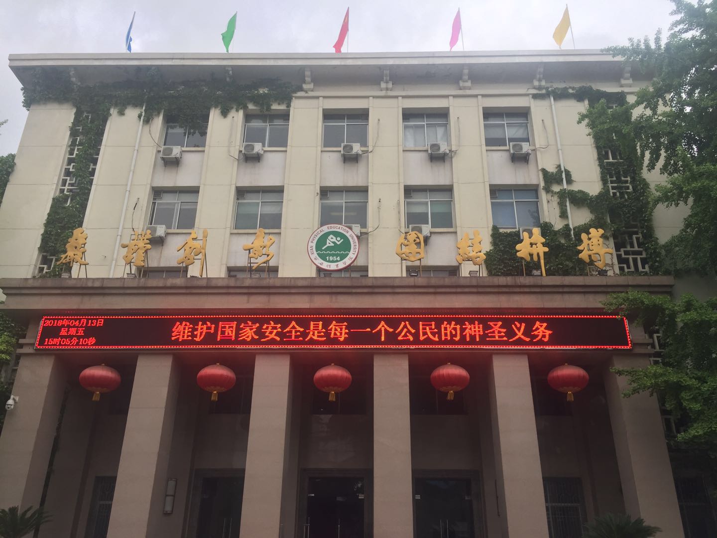1、2018年4月8日至16日,充分利用学院行政楼、教学楼两处LED显示屏宣传国家安全知识,在校本部及沣峪口校区悬挂国家安全的横幅六条,有力地促进了学生的思想道德修养建设,提高广大师生的国家安全意识。