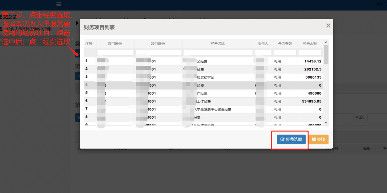 第二步点击经费选取,选择本次收入申报需要使用的项目经费,点击选中后,点“经费选取”