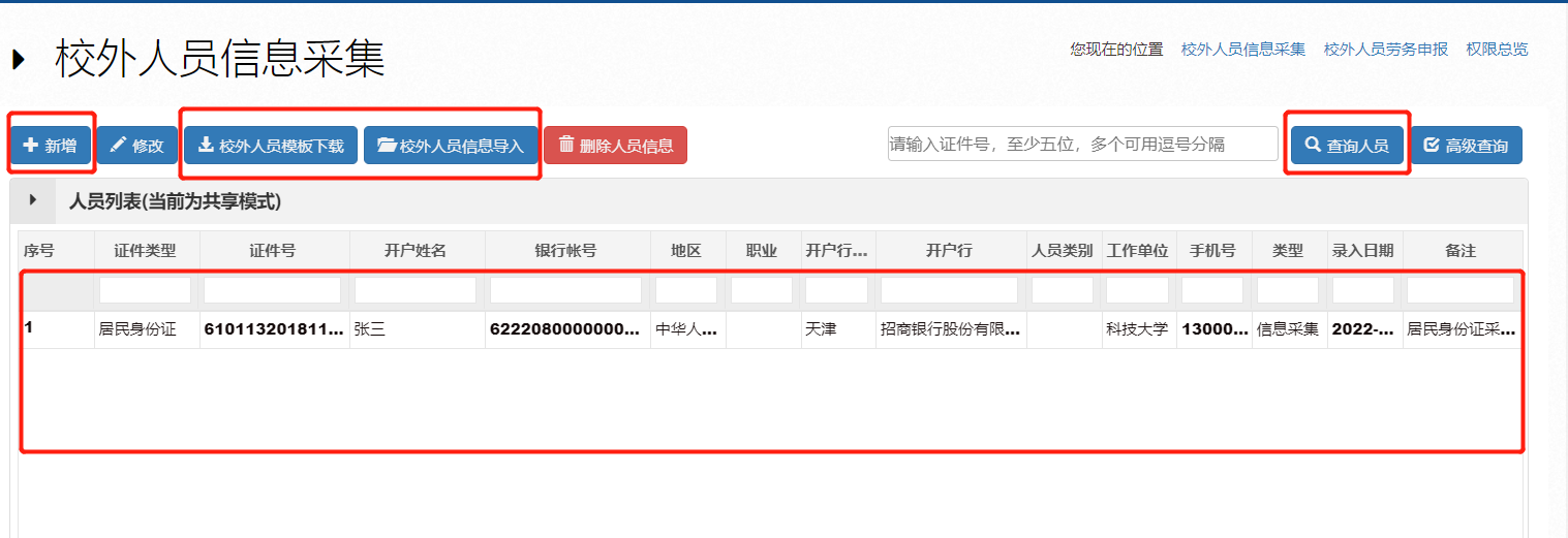 校外人员信息采集分两种方式:1新增2模板导入,如上图所示。