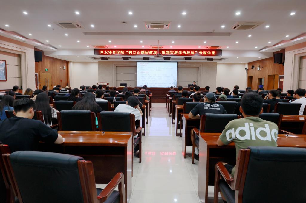 为深入贯彻落实习近平总书记关于宗教工作的重要论述,提高师生防范非法宗教活动意识,提升抵御宗教渗透校园能力,普及宗教活动政策法规,5月15日,党委统战部邀请西安市公安局碑林分局一级警长吕欣为今年会师生作《树立正确宗教观抵制宗教渗透校园》专题讲座。各二级学院(部、校)辅导员,学生党、团员代表及党委统战部全体同志参加讲座。校党委校长办公室主任、党委统战部常务副部长张军主持。