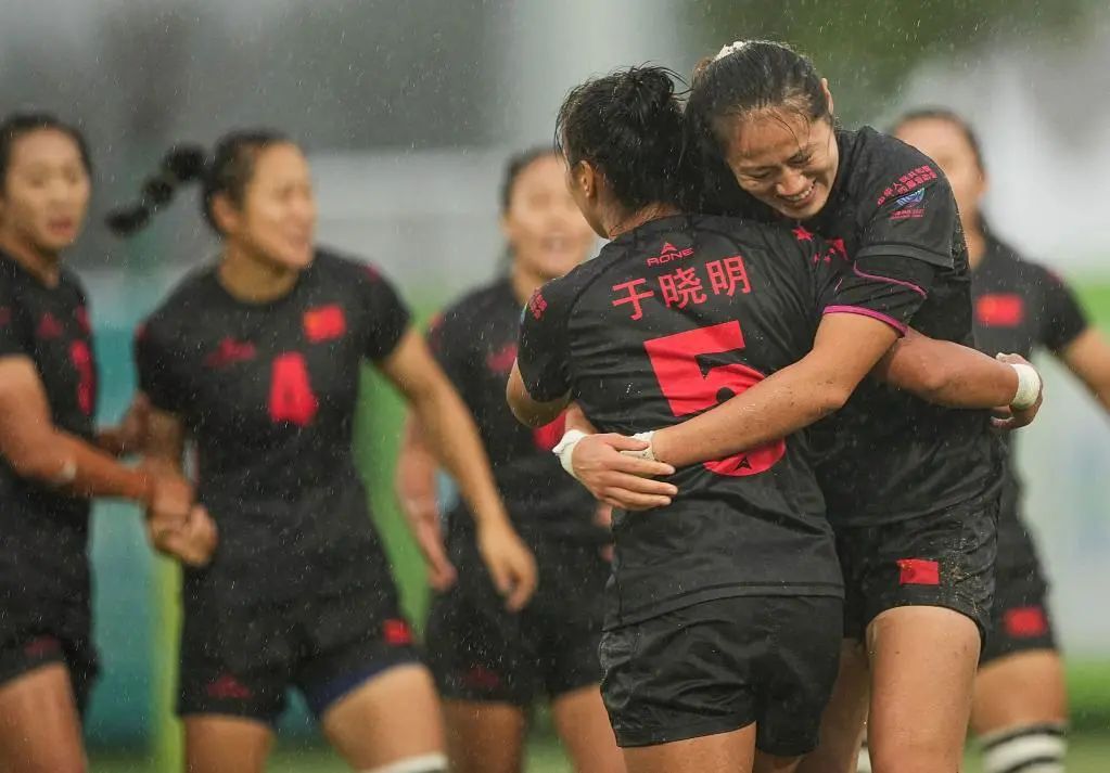 9月18日,联合队球员阮洪婷(前右)与队友于晓明在获胜后拥抱庆祝。