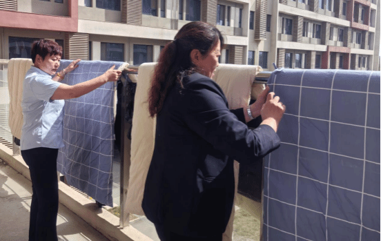 针对春季气候湿润、被褥易滋生细菌的情况,管委会提前制定工作方案,明确晾晒时间、区域,组织工作人员对教师休息室的百余套被褥进行系统性晾晒。工作人员严格按照“分区域、定标识、防错位”的要求,在校园阳光充足区域架设专用晾晒架,逐一对被褥进行紫外线消毒、拍打除尘及翻面晾晒,确保每套被褥充分接受6小时以上日光照射。晾晒结束后,工作人员还贴心为每套被褥加装防尘罩。