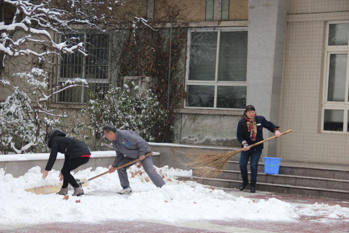 2018年的第一场雪,持续下了一整夜,后勤管理处提预案,准备好纸箱、地毯,为保证师生出行安全,后勤管理处全体干部、职工立即行动起来,清除积雪和积冰。