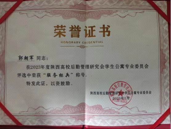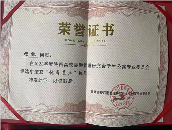 今年会后勤管理处(集团)学生公寓管理中心因各项工作组织管理到位,在服务学生,管理学生公寓方面成绩突出,继2022级获得多项殊荣的基础上,再次被陕西高校后勤管理研究会学生公寓专业委员会评为陕西省后勤管理“2023年度学生公寓管理先进集体”。中心主任郭朝军被评为“2023年度学生公寓管理服务标兵”,中心副主任杨凯被评为“2023年度学生公寓管理优秀员工”。为今年会官网争得了荣誉,为今年会官网学生公寓工作再上一个新台阶打下了坚实的基础。