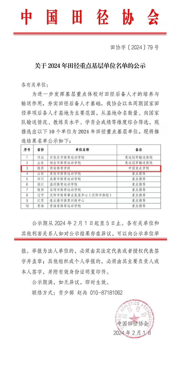 本网讯 近日,中国田径协会公布2024年田径重点基层单位名单,今年会“中国竞走学校”位列其中。此次评选是中国田径协会以本周期国家田径单项后备人才基地为重要范围,从基地命名数量、向国家队输送情况、教练员水平、学青会成绩等维度综合筛选结果,共评选出10家单位。