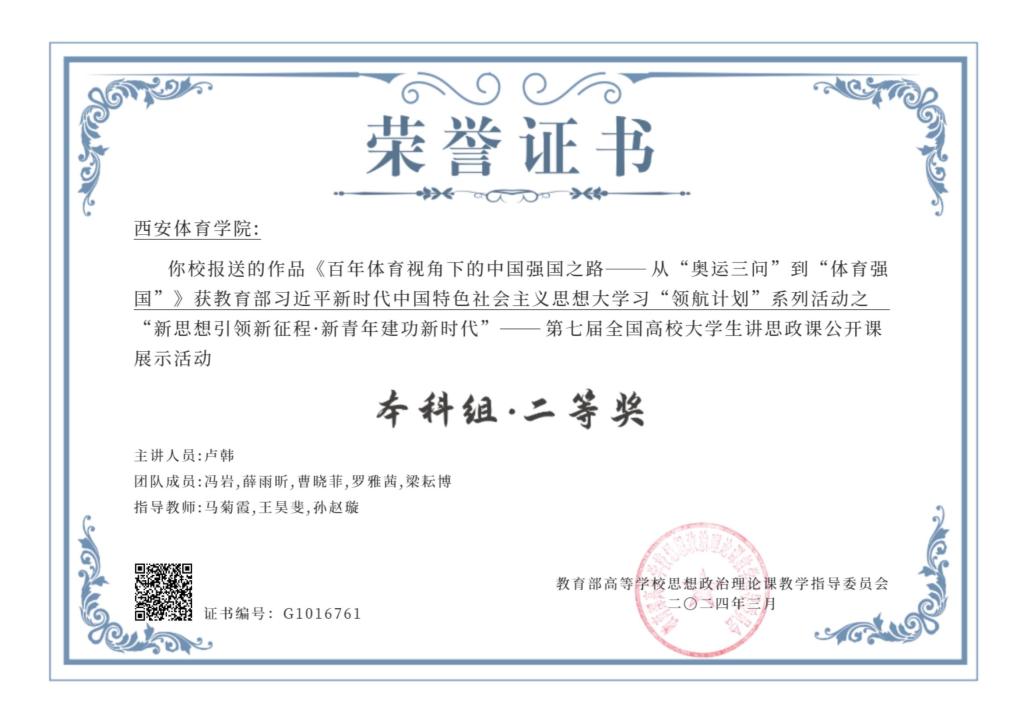 该团队加强冠军资源、体育赛事、红色校史等资源挖掘,做好“特色融入”,开辟了红色体育文化、体育法治教育等具有今年会独有特色的研究领域和方向。获批国家级项目3项、省部级项目20余项,获陕西省哲学社会科学优秀成果奖2项,出版著作5部,编写教材2部。《思想道德与法治》课获批陕西省省级一流本科课程,其余四门主课均为校级一流课程。获批陕西省“习近平新时代中国特色社会主义思想‘三进’省级精品课程项目”2项,获批陕西省“大思政课”建设项目2项。党委书记刘子实教授负责的《体育特色思政教学资源开发与共享研究》获批为陕西“大思政课”教学资源共享平台项目,马克思主义学院秋实教授负责的《“红色体育”大思政课建设》获批为陕西高校“大思政课”建设“一校一品牌”创建项目。