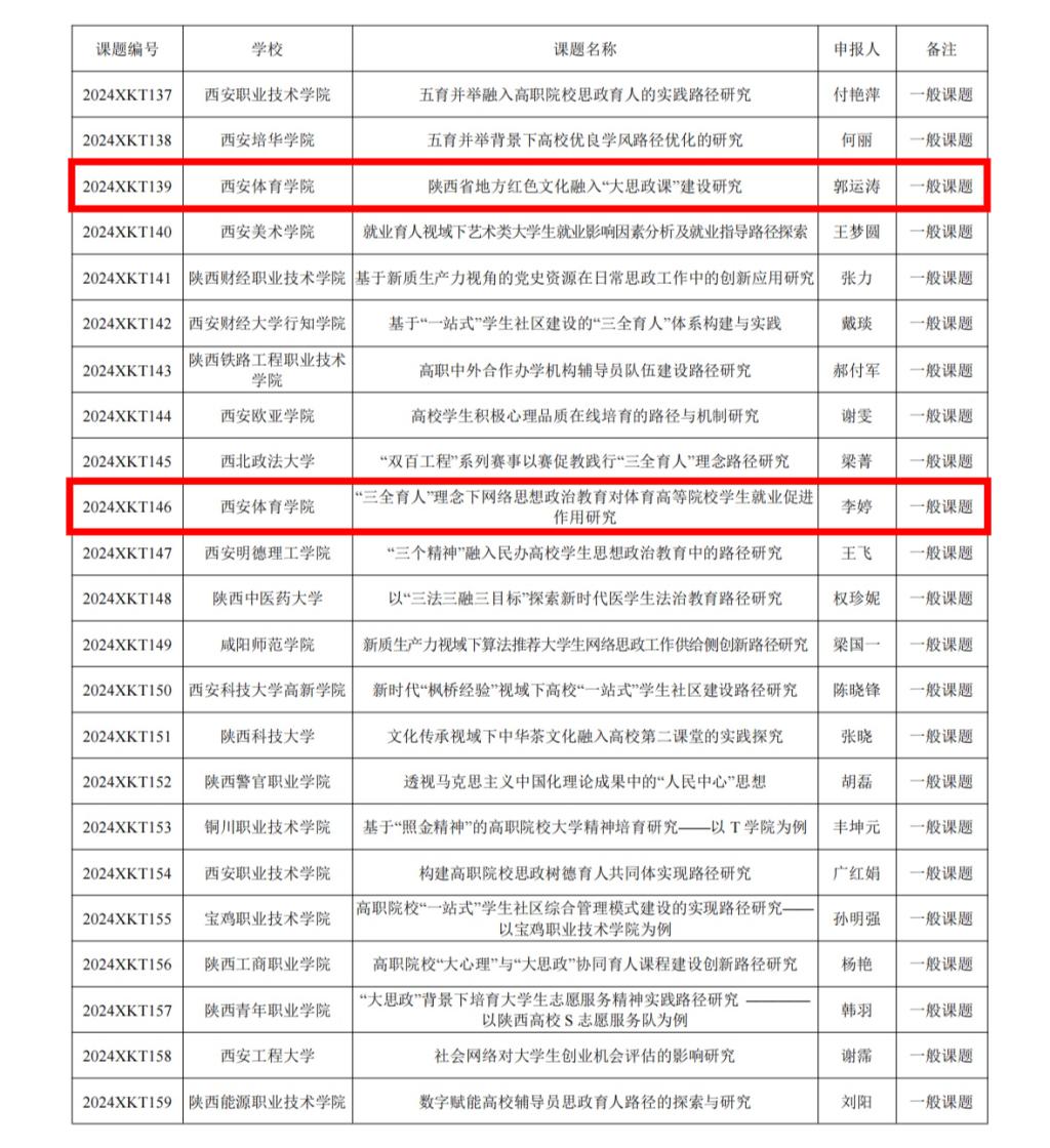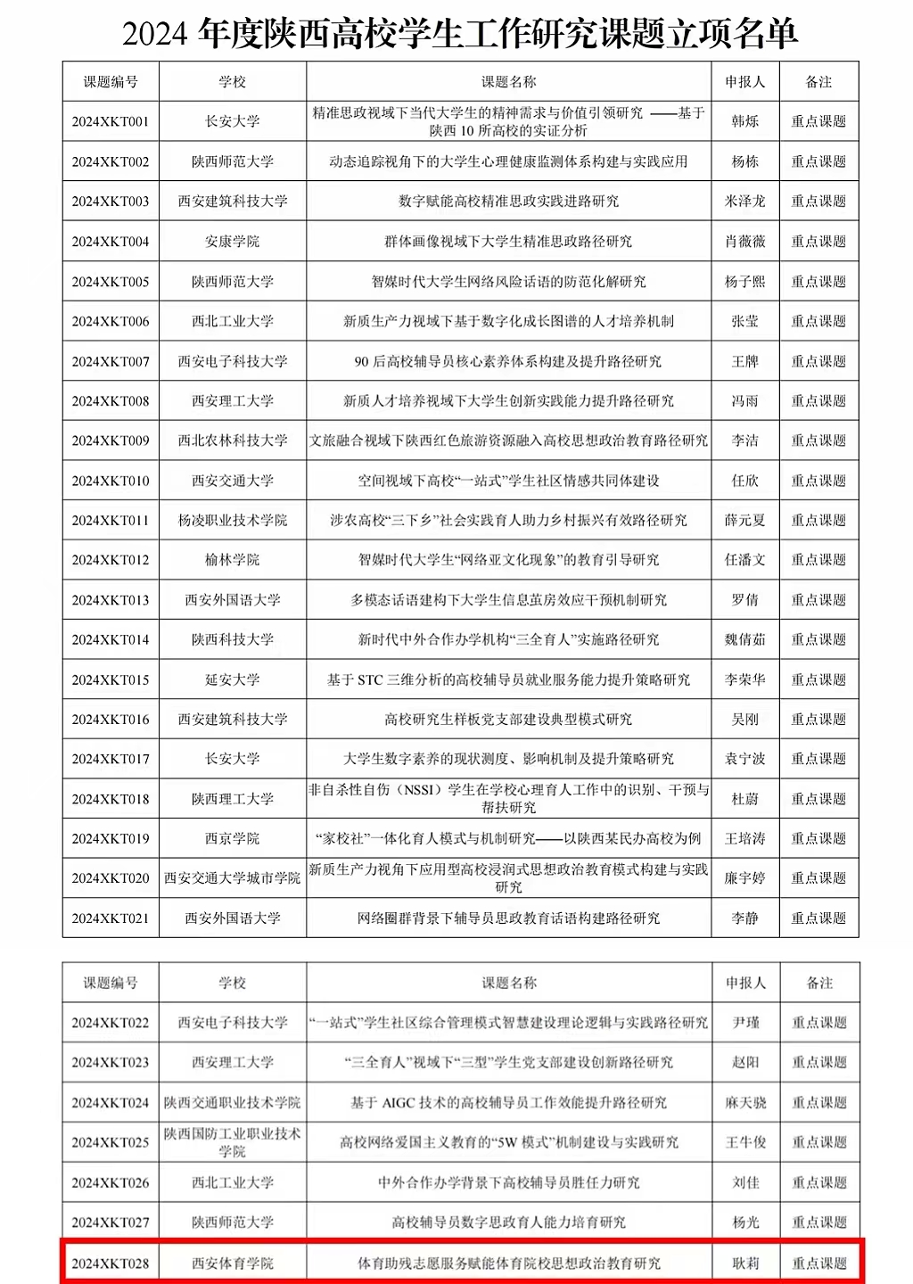 根据《中共陕西省委教育工委办公室关于开展2024年度陕西高校辅导员队伍素质能力提升工程系列活动的通知》(陕教工生办〔2024〕4号)精神,今年会辅导员积极响应并参与,经过学校推荐、专家评审以及委厅审定,最终体育教育学院耿莉申报的《体育助残志愿服务赋能体育院校思想政治教育研究》获得重点课题项目立项;研究生部郭运涛《陕西省地方红色文化融入“大思政课”建设研究》、李婷《“三全育人”理念下网络思想政治教育对体育高等院校学生就业促进作用研究》获得一般课题项目立项。