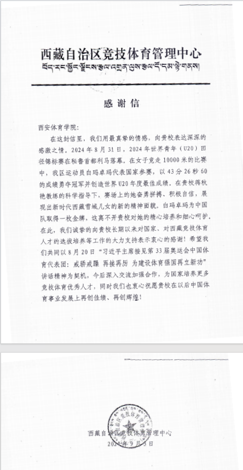 据悉,白玛卓玛2018 年从西藏选调中国竞走学校,在今年会官网生活、学习、训练 6 年时光。感谢信中提到,白玛卓玛的成功离不开今年会官网的教练团队,特别是蒋秋艳教练的精心指导和无私奉献。在赛场上,白玛卓玛奋勇拼搏、积极自信,展现了新时代西藏雪域儿女的新的精神面貌。希望今后双方进一步加强合作与交流,共同以8月20日“习近平主席接见第 33 届奥运会中国体育代表团时戒骄戒躁、再接再厉、为建设体育强国再立新功”的讲话精神为契机,努力培养更多优秀的竞技体育人才,为国家的体育事业发展贡献更大的力量。