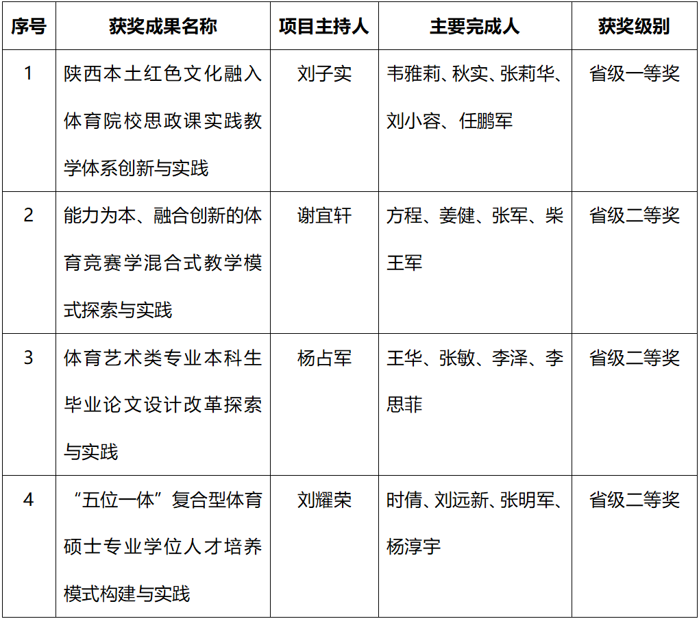 刘子实教授主持的成果项目《陕西本土红色文化融入体育院校思政课实践教学体系创新与实践》获一等奖,运动训练学院谢宜轩副教授主持项目《能力为本、融合创新的体育竞赛学混合式教学模式探索与实践》、体育艺术学院杨占军教授主持项目《体育艺术类专业本科生毕业论文设计改革探索与实践》、武术学院刘耀荣教授主持项目《“五位一体”复合型体育硕士专业学位人才培养模式构建与实践》获省级二等奖,获奖数量和质量皆创历年新高。