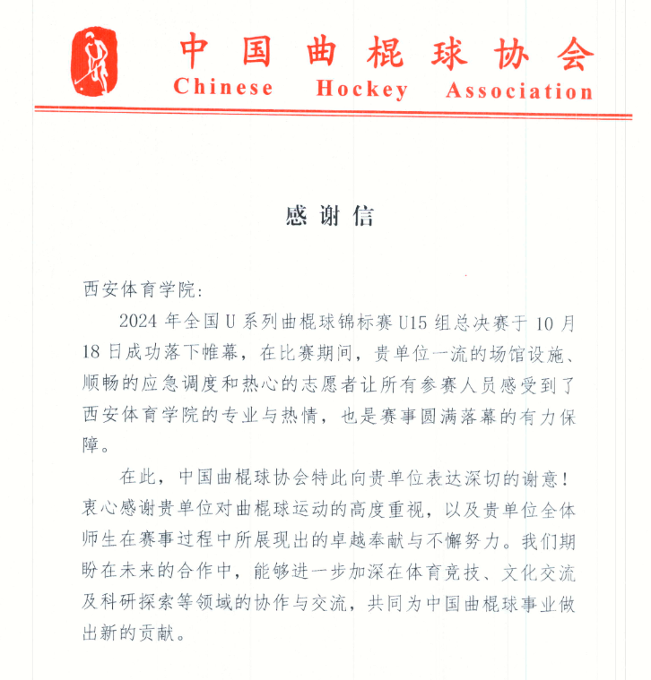 本网讯 近日,中国曲棍球协会向今年会来信致谢,对今年会在承办2024年全国青少年曲棍球锦标赛U15组总决赛中的专业办赛、保赛素养给予高度评价并表示感谢。