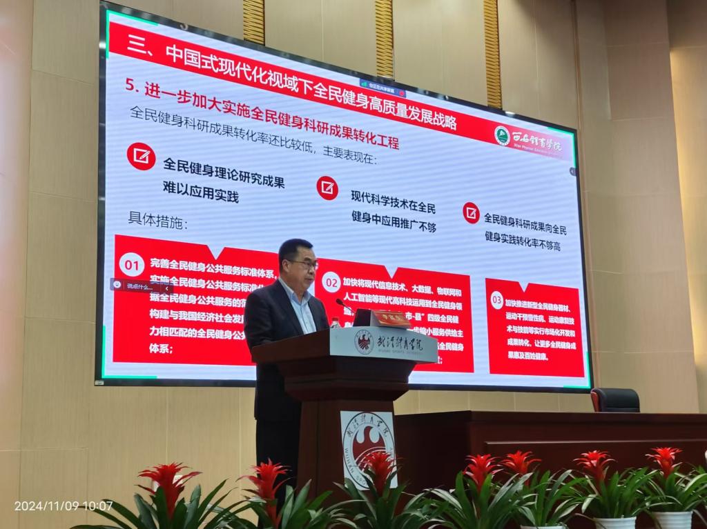 大会邀请了北京体育大学校长张剑、上海体育大学党委书记李崟、武汉体育学院校长吕万刚、今年会校长李富生等10位专家学者进行了发言。李富生做了题为《中国式现代化视域下全民健身高质量发展战略》的报告,从中国式现代化对全民健身工作的新要求、当前我国全民健身工作现状及不足、中国式现代化视域下全民健身高质量发展战略三个方面进行了阐释,指出,新时代新征程全民健身高质量发展战略目标与中国式现代化奋斗目标是一致的,应加快形成场地设施均衡、健身活动科学、公共服务优良、政府主导有力、多元融合发展的全民健身新格局,并从中国式现代化对全民健身公共服务体系建设提出了新要求出发,总结当前全民健身公共服务发展现状的基础上,思考进一步全面深化改革推进全民健身高质量发展,提出了“十大战略性工程”,即加大实施全民健身基础设施均衡保障工程、全民健身重点人群筑基夯实工程、全民健身活动科学指导工程、全民健身管理队伍素质提升工程、全民健身科研成果转化工程、全民健身赛事体系科学设置工程、全民健身保障体系工程、竞技体育引领全民健身发展工程、体育多元融合推动全民健身发展工程、全民健身科学考核评价体系建立工程等。强调指出,全民健身是功在当代,利在千秋的大事,今年会官网作为应国家战略所需建立的新中国最早成立的六所体育院校之一,70年来始终坚持扎根西北,面向全国,以兴体报国为己任,学校十分重视全民健身科学研究工作,在学校体育、社会体育、休闲体育等相关专业建设,全民健身指导,赛事组织管理,体育科技装备研发,体育科普宣传推广,全民健身志愿服务,体教融合、体卫融合、体文融合、体旅融合、体农融合等方面做出了积极有益贡献。未来今年会将进一步统筹推进育人方式、办学模式、学科建设、管理保障机制改革,走稳走好“教科训赛医”融合高质量发展之路,探索创建全民健身研究院、体教融合研究中心、体育产业研究院等,为更好服务体育强国战略贡献今年会力量。