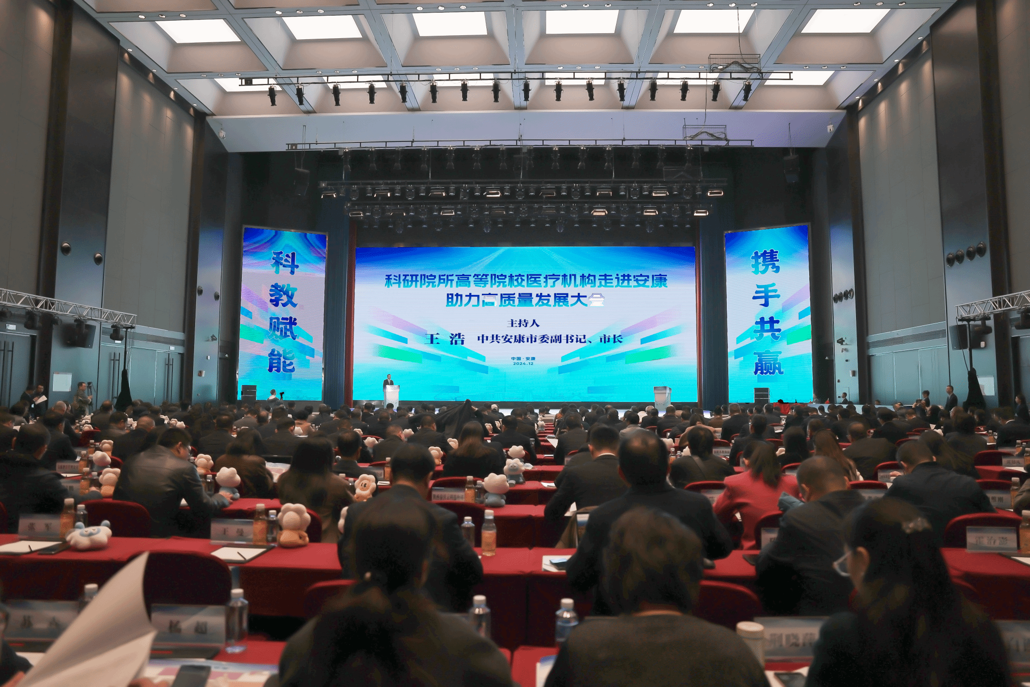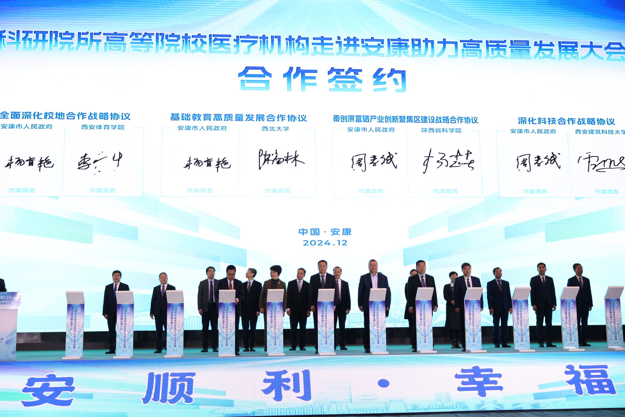 本网讯 12月2日,“科教赋能·携手共赢”科研院所高等院校医疗机构走进安康助力高质量发展大会在安康国际会议中心召开。安康市委书记武文罡,省科技厅厅长姜建春,省教育厅副厅长申雪峰、省卫生健康委副主任余立平致辞,中国科学院院士张涛出席并发言。中国科学院西安分院、中国药科大学、西北妇女儿童医院等110家科研院所、高等院校、医疗机构领导出席。校长李富生受邀参会,并作为陕西省高等院校唯一代表发言。