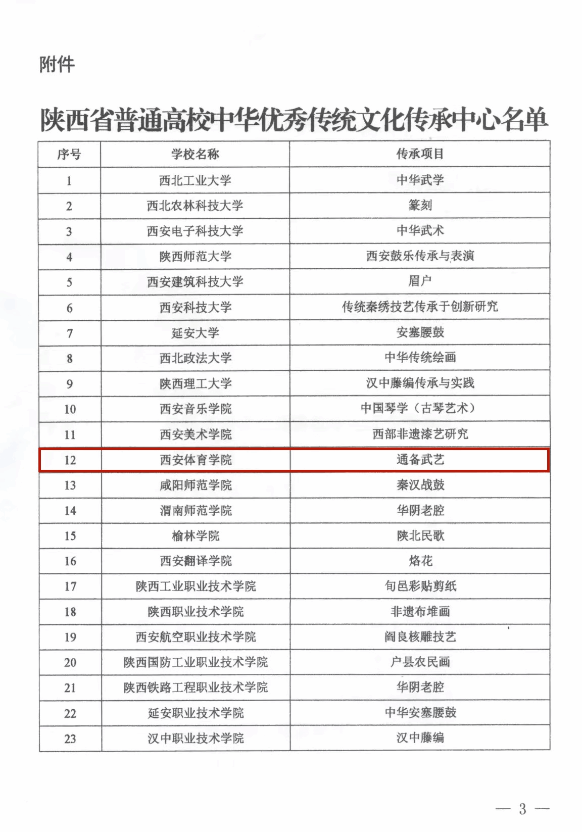 本网讯 近日,陕西省教育厅公布了陕西省普通高校中华优秀传统文化传承中心名单,经全省各高校自主申报、省教育厅组织专家遴选与公示,由武术学院牵头申报的“通备武艺”传承项目,作为此次全省遴选认定的23个传承中心之一,成功入选。