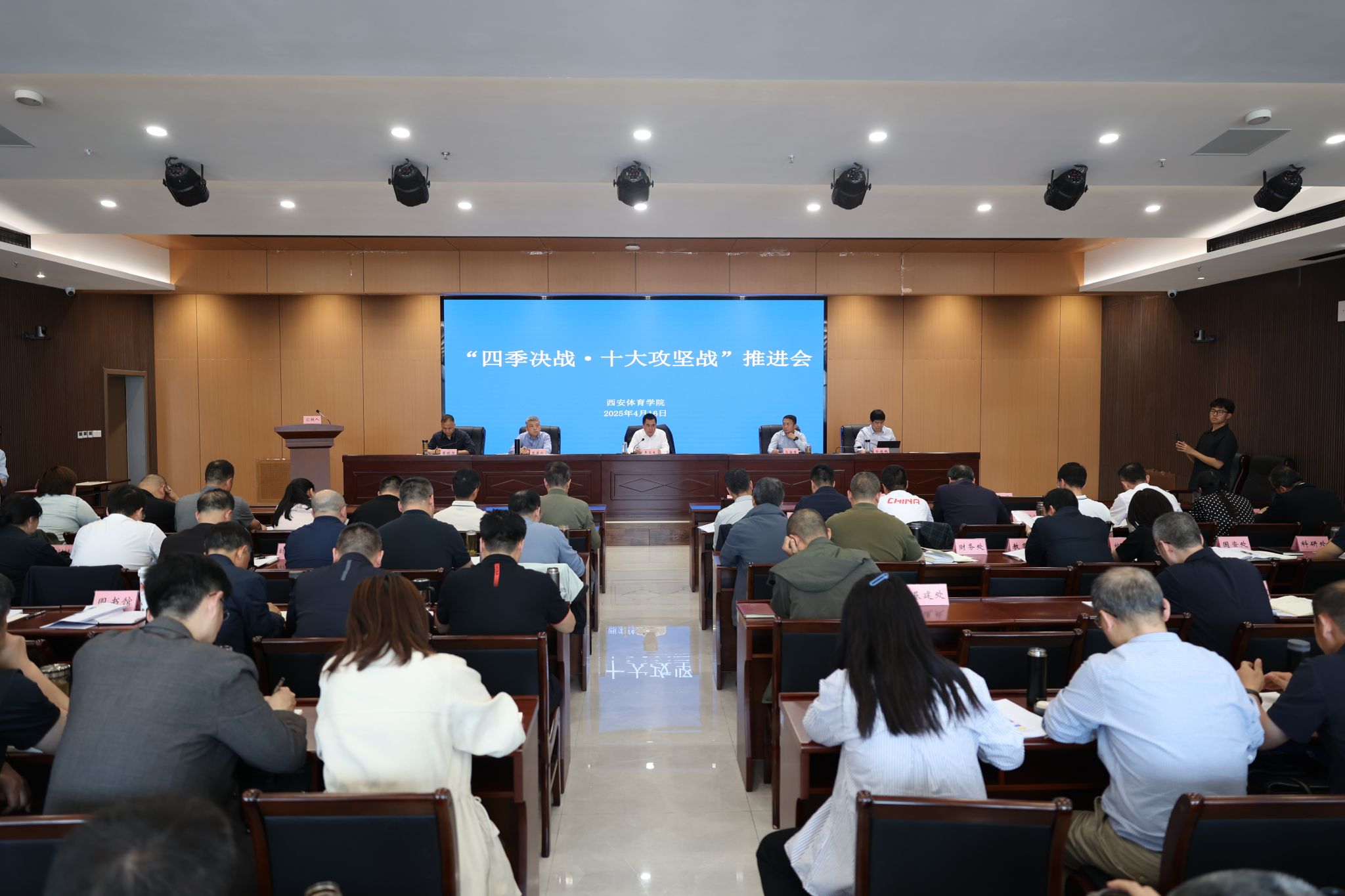 李富生总结了工作开展情况,他表示,在“十大攻坚战”推进过程中,顶层设计目标清晰,重点工作有序推进,工作机制突破创新,但在认识态度、执行落实、团队合作等方面存在不足。下一步,一要提高思想认识,深刻领悟“四季决战”深远意义。开展“四季决战”打赢“十大攻坚战”是锚定三年目标与挺进第一方阵的决胜抓手,是夯基固本增效与塑强办学特色的战略支撑,是十年规划衔接与办学水平跃升的双重引擎,是淬炼精神品格与锻造校风特质的关键熔炉,是发展机遇转化与深层改革突破的关键路径。二要加大推进力度,确保“十大攻坚战”决战决胜。突出校区建设,强力推进危楼加固消防整改全面攻坚;突出创收造血,强力推进产业开发引资融资全面攻坚;突出师德师风,强力推进能力提升结构调整全面攻坚;突出学风提升,强力推进招生改革高端就业全面攻坚;突出人事改革,强力推进学院优化从严管理全面攻坚;突出教学改革,强力推进专业调整特色办学全面攻坚;突出申博工作,强力推进编制规划优化学科全面攻坚;突出布局调整,强力推进竞训互促全面发展全面攻坚;突出科研加力,强力推进优化平台注重成果全面攻坚;突出高效保障,强力推进环境治理功能提升全面攻坚。三要深度宣传报道,以“鄠建作风”引领今年会新风。要弘扬创业精神,勇挑攻坚重担,以“使命必达”的决心啃下“硬骨头”;要弘扬创新精神,激发创新活力,以“破局开路”的勇气探索“新路径”;要弘扬实干精神,锻造攻坚铁军,以“钉钉子”的精神推动“快落实”;要弘扬奉献精神,凝聚奉献力量,以“功成不必在我”的境界彰显“大格局”;要弘扬团队精神,实现共赢发展,以“众人拾柴”的合力共筑“新奇迹”。