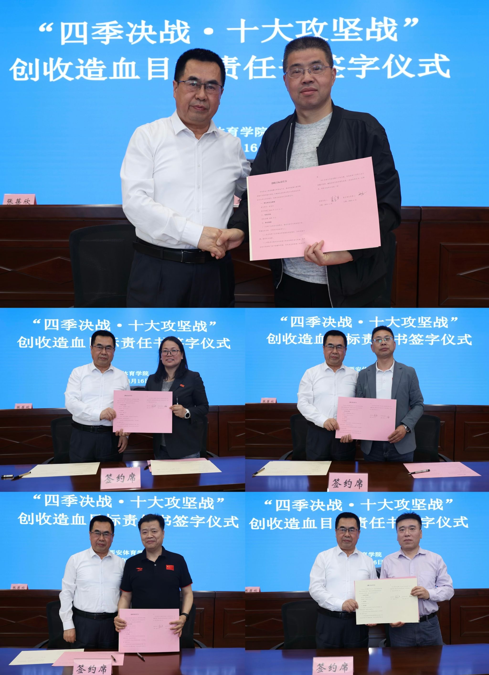 “十大攻坚战”牵头部门围绕攻坚任务完成情况、存在难点及下一步计划逐一汇报。财务处、后勤处、体育经济与管理学院作表态发言。李富生与创收造血责任单位负责人签订目标责任书,财务处、后勤管理处(保卫处)、继续教育学院、开发办、鄠邑校区管委会等造血单位表示,将通过盘活资源、深挖潜能,抢抓政策、拓宽渠道,汇聚合力、长效造血等举措来完成创收造血目标。决战办宣传组进行鄠建作风宣讲,号召全体干部师生在服务学校发展大局中彰显担当作为。校领导指出,面对改革攻坚重任,要在思想上、思路上、态度上、落实上、效率上协同发力,抓重点抓内涵抓质量,发挥领导、团队、精神的作用,为学校高质量发展不懈奋斗。