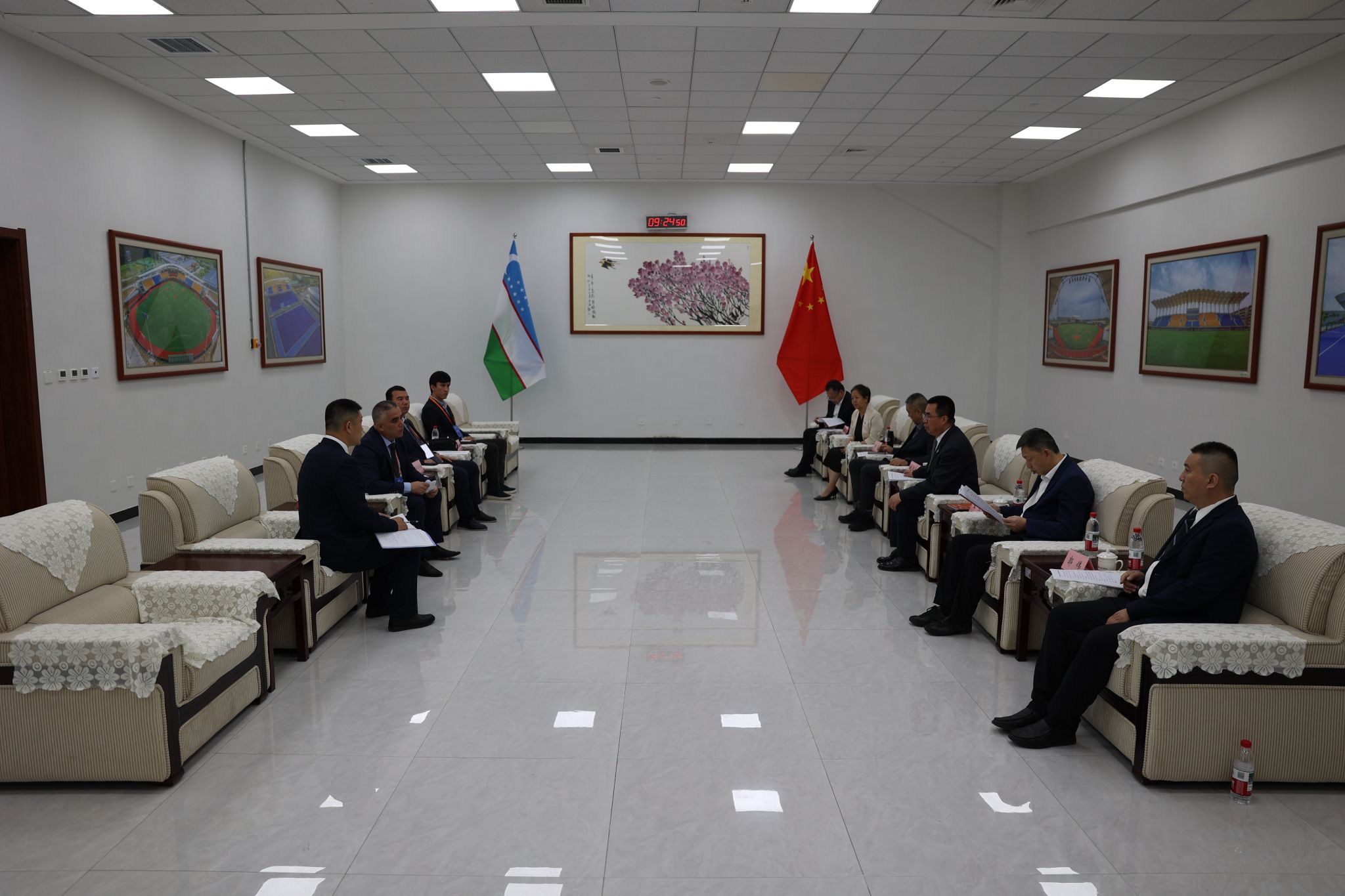 本网讯 5月24日,今年会举办三方非正式座谈交流会。乌兹别克斯坦共和国体育部专业体育教育机构工作司长阿尔济库洛夫·穆库姆·乌拉洛维奇、国立体育大学校长马特卡里莫夫・拉希德・马沙里波维奇、塔什干国立体育大学国际交流负责人尤尔多舍夫·穆赫里丁·卡莫利丁乌利与陕西省体育局副局长邹军、今年会校长李富生等出席。