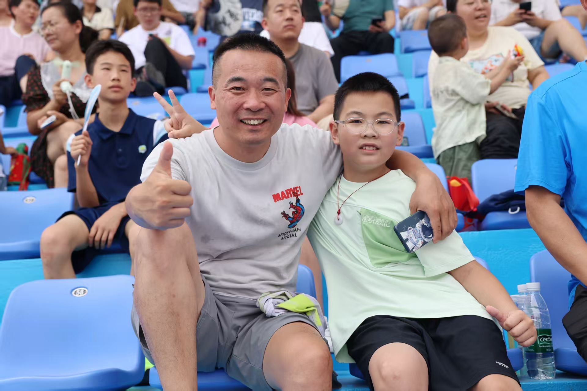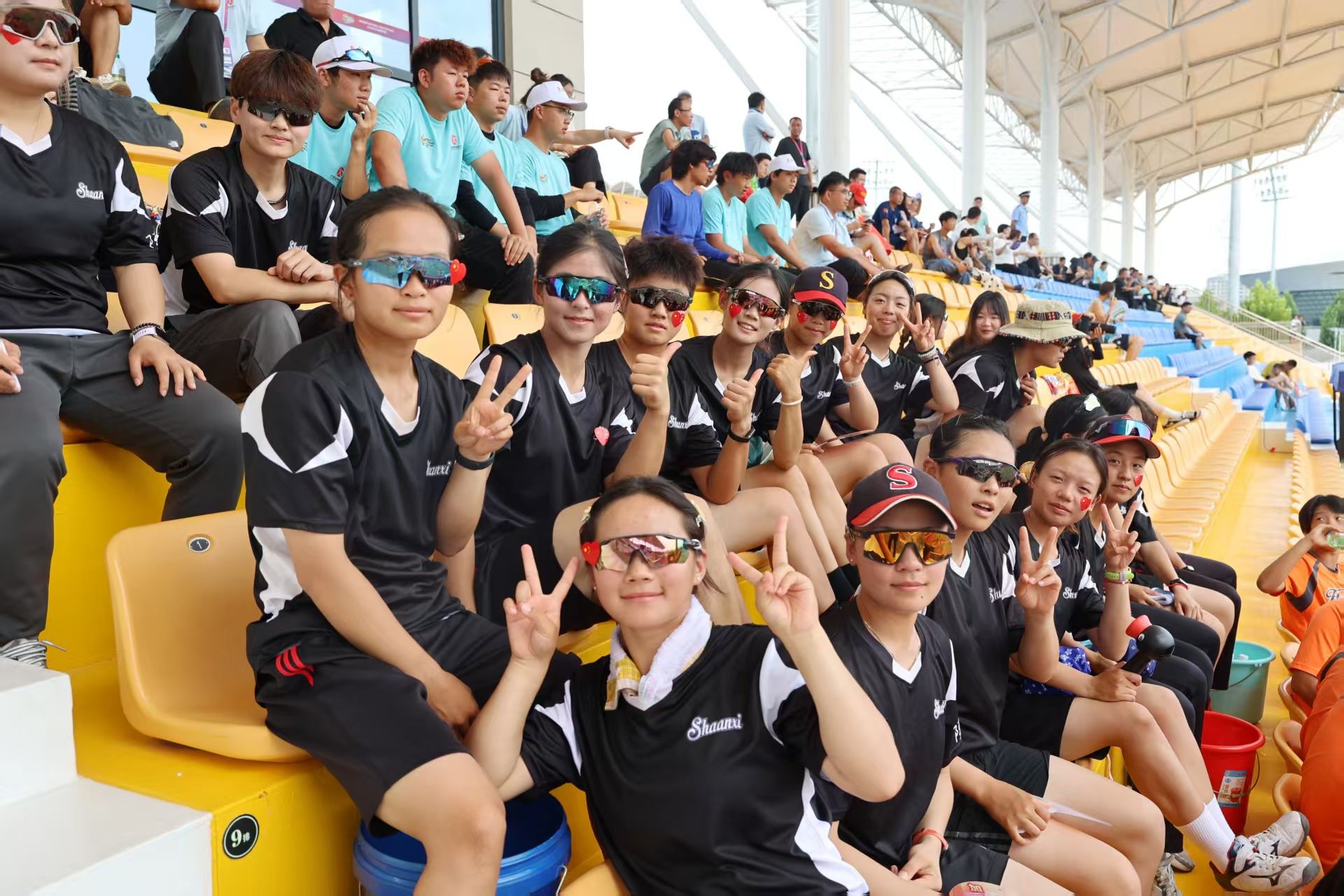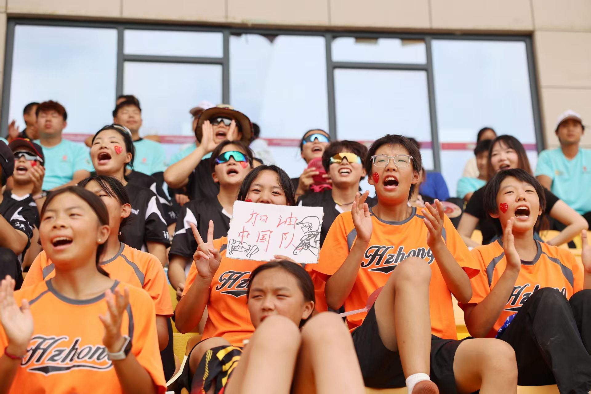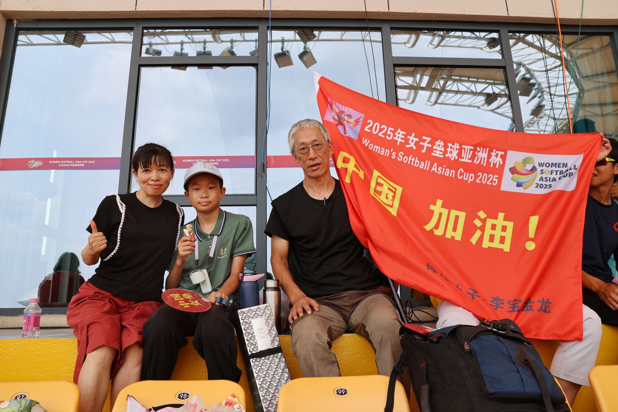 人群中有个墨绿色的小小身影在聚精会神的观赛。“看!棒球小子李宝金龙又来了!”13岁的少年举着自制的旗帜,上面绘着赛事徽标和“中国加油”的大字:“今天的比赛很激烈也很持久,打了两个小时了还没分出胜负,运动员姐姐们真的不容易。”这面旗帜承载了李宝金龙对垒球的热爱。“在今年会官网的赛场上挥舞这面旗,感觉格外有意义,每次中国队得分,我都忍不住挥舞它!”他的父亲笑着说。