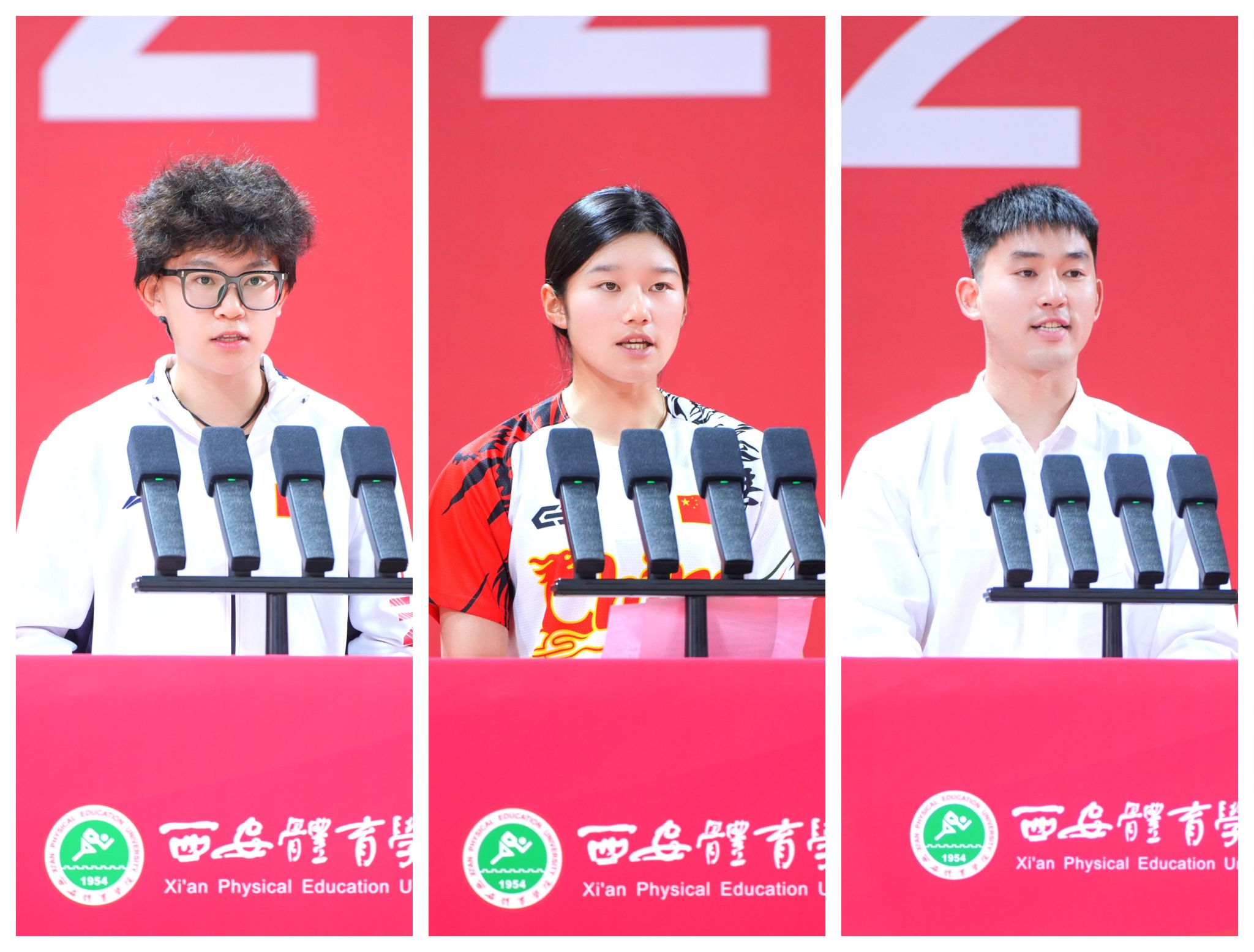 体育教育训练学院学生隋易霖、李欣甜、梁天乐分别作为在校生代表、本科生新生代表、研究生新生代表发言,表示将珍惜时光、勤学苦练,积极参与实践创新,传承中华体育精神,尽快适应新环境新要求,努力成长为有理想、有本领、有担当的高素质体育人才,不负时代使命与师长期望。