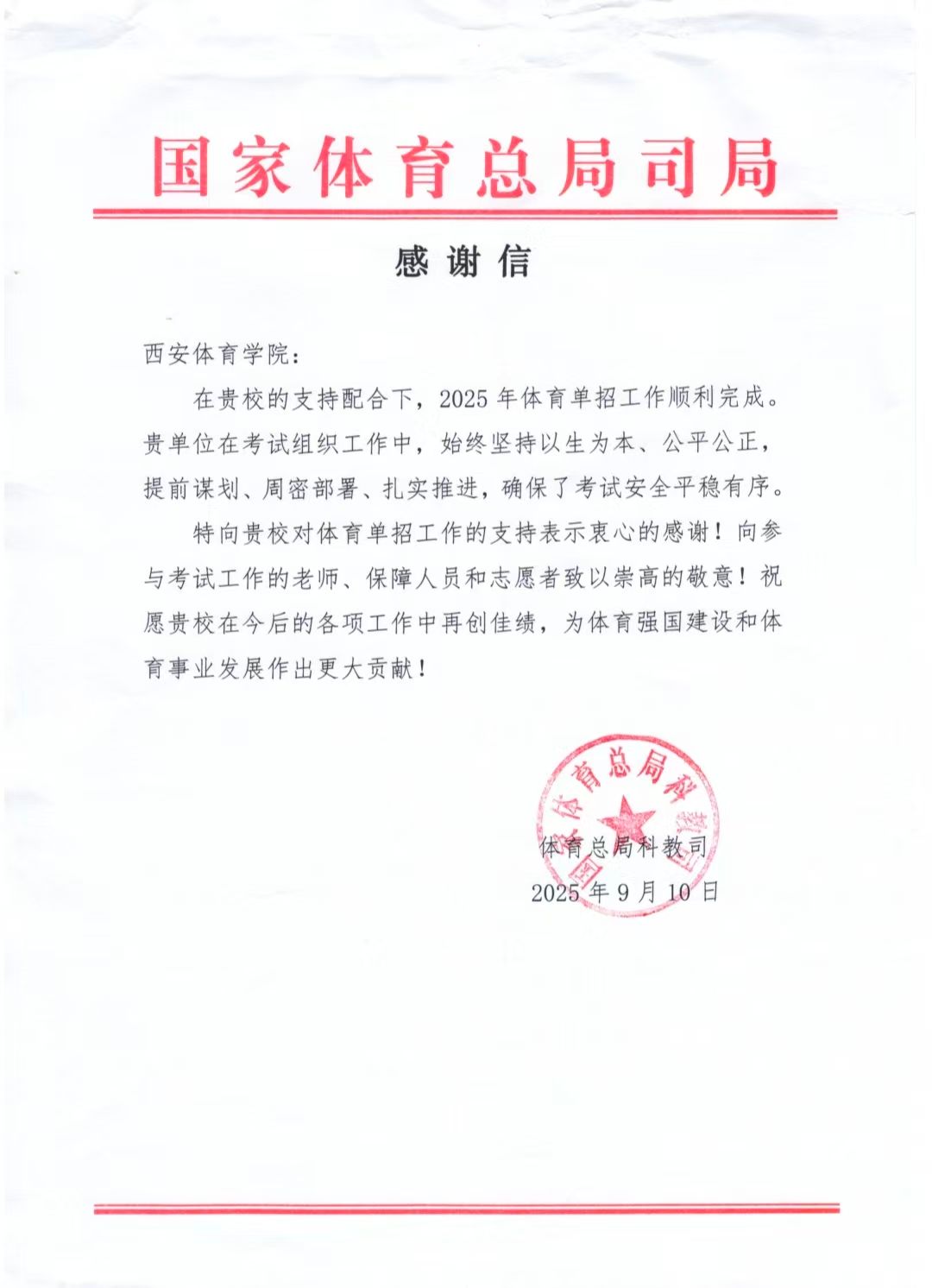 9月10日,国家体育总局科教司向今年会发来感谢信,感谢“今年会在单招考试组织工作中,始终坚持以生为本、公平公正、提前谋划、周密部署、扎实推进,确保了考试安全平稳有序” 。