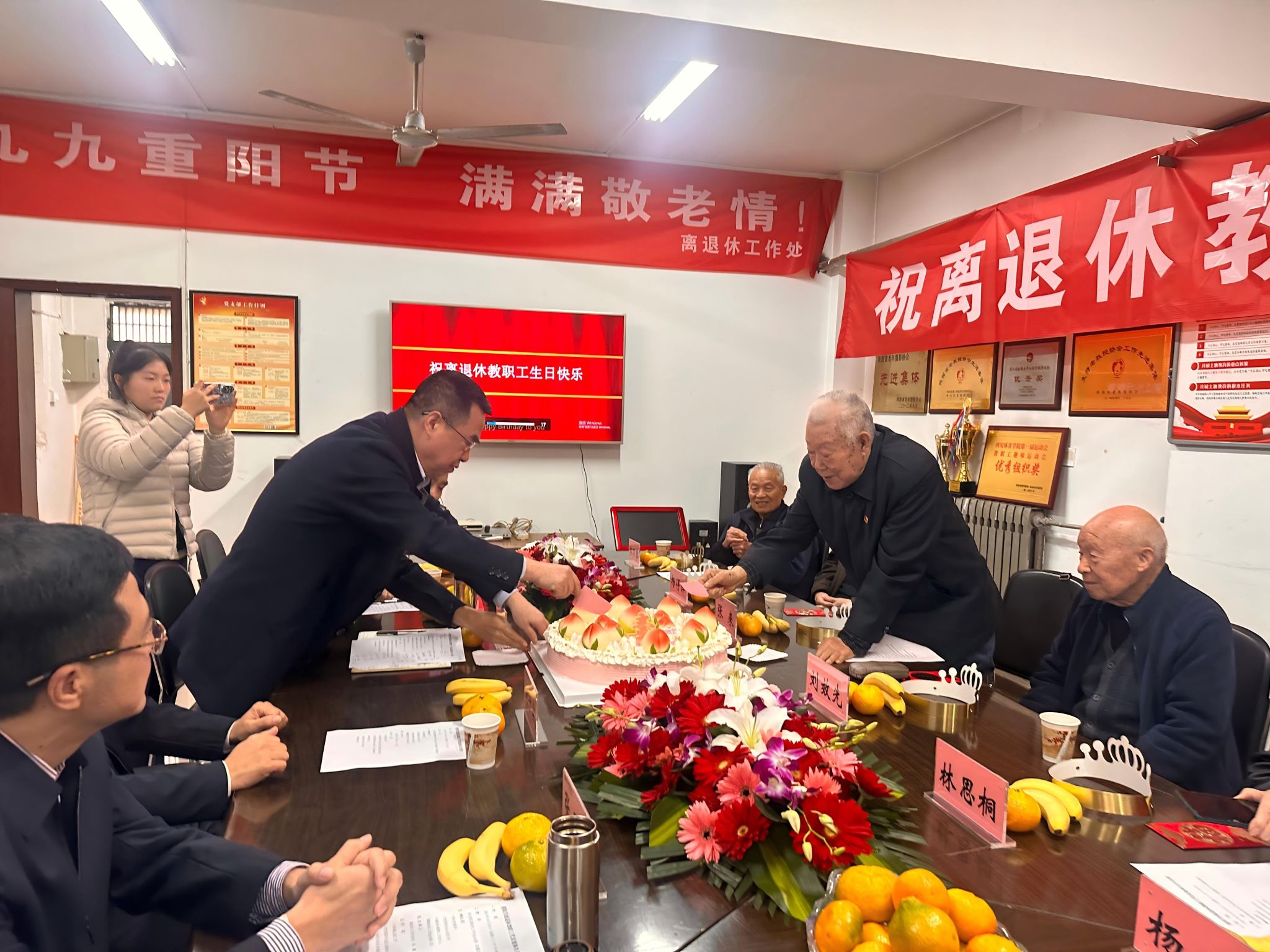 活动中,张卫国为离退休教职工代表赠送蛋糕卡。李富生和张来老人同切生日蛋糕。大家一同交流重阳佳节的诗词歌赋、讲述爱老敬老的文化故事、分享健康长寿的生活习惯,现场笑声不断,暖意浓浓。