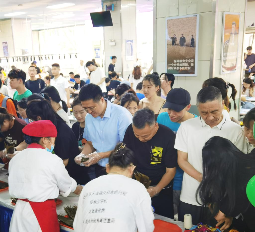 本网讯          为庆祝建党100周年,弘扬中华民族的传统文化,在端午节到来之际,后勤管理处(集团)联合校学生会在学生餐厅举办“端午品香粽”师生互动活动,副校长张卫国、后勤管理处领导及学生餐厅工作人员与同学们一起参与了本次活动。