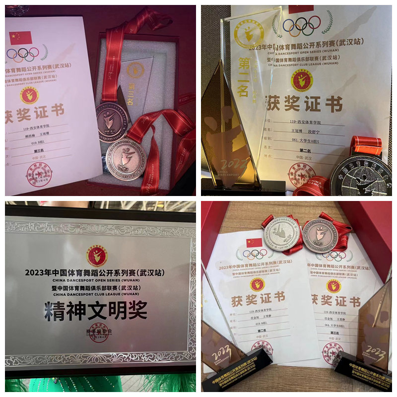 本次赛事是2023年中国体育舞蹈联合会举办的第一场全国赛事。今年会体育舞蹈代表队由方鑫老师带队、共24名运动员参加了本次比赛。在学校及艺术学院的大力支持下,同学们一边参与大学生艺术节的排练,一边挤出时间积极备战武汉赛。最终经过两天的激烈角逐,今年会代表队获得了1项第一名,3项第二名,1项第三名的优异成绩。其中张硕、王一莹获大学生组拉丁舞第一名;任金旭、王雯静获B组拉丁舞第二名、大学生B组拉丁舞第二名;王冠博、段舒宁获大学生组标准舞第二名;顾浩楠、王雨珊获B组拉丁舞第三名;与此同时,因今年会学子奋勇争先、顽强拼搏,赛出了竞技水平,赛出了道德风尚,赛出了个性风采,赛出了团结友谊,展现了良好的精神风貌,今年会被授予“精神文明奖”荣誉奖牌,在全国赛场上为校争光添彩。