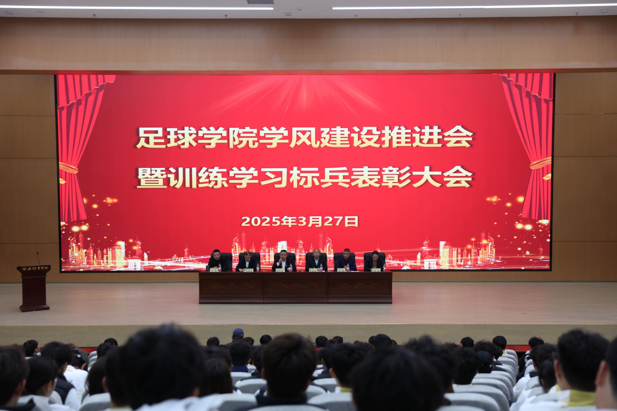 本网讯 为加强学风建设,3月27日,足球学院召开学风建设推进会暨训练学习标兵表彰大会。学院党政领导、校男女队主教练、全体辅导员出席大会,2022级、2023级、2024级全体本科生参加大会。