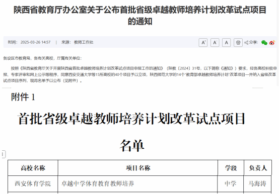 本网讯 近日,陕西省教育厅公布了首批省级卓越教师培养计划改革试点项目,今年会党委副书记、体育教育学院院长马海涛教授负责的“卓越中学体育教育教师培养”项目入选。
