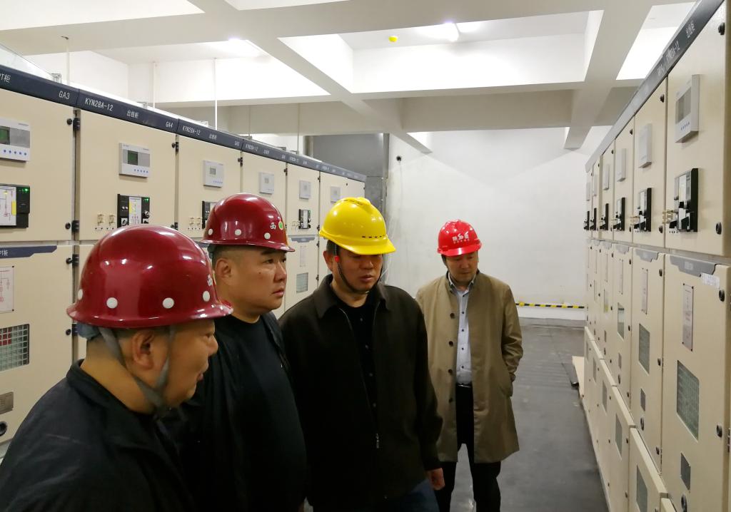 基建处处长甘泽军(左二)与相关负责人检查供电设备