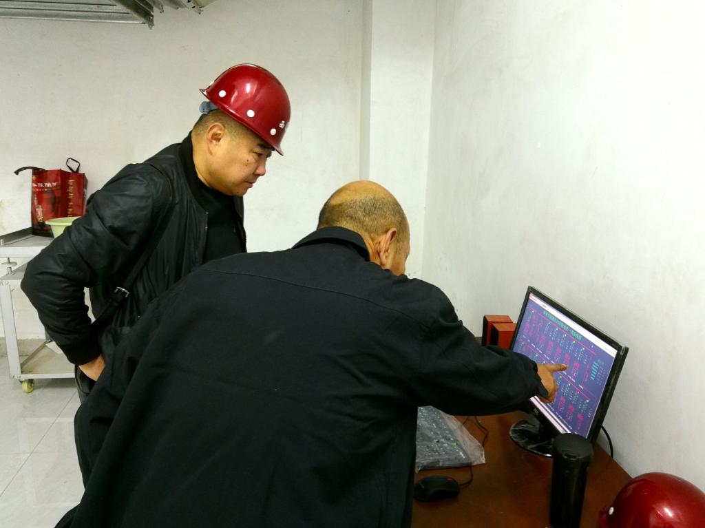基建处处长甘泽军(左)了解供电监控系统情况