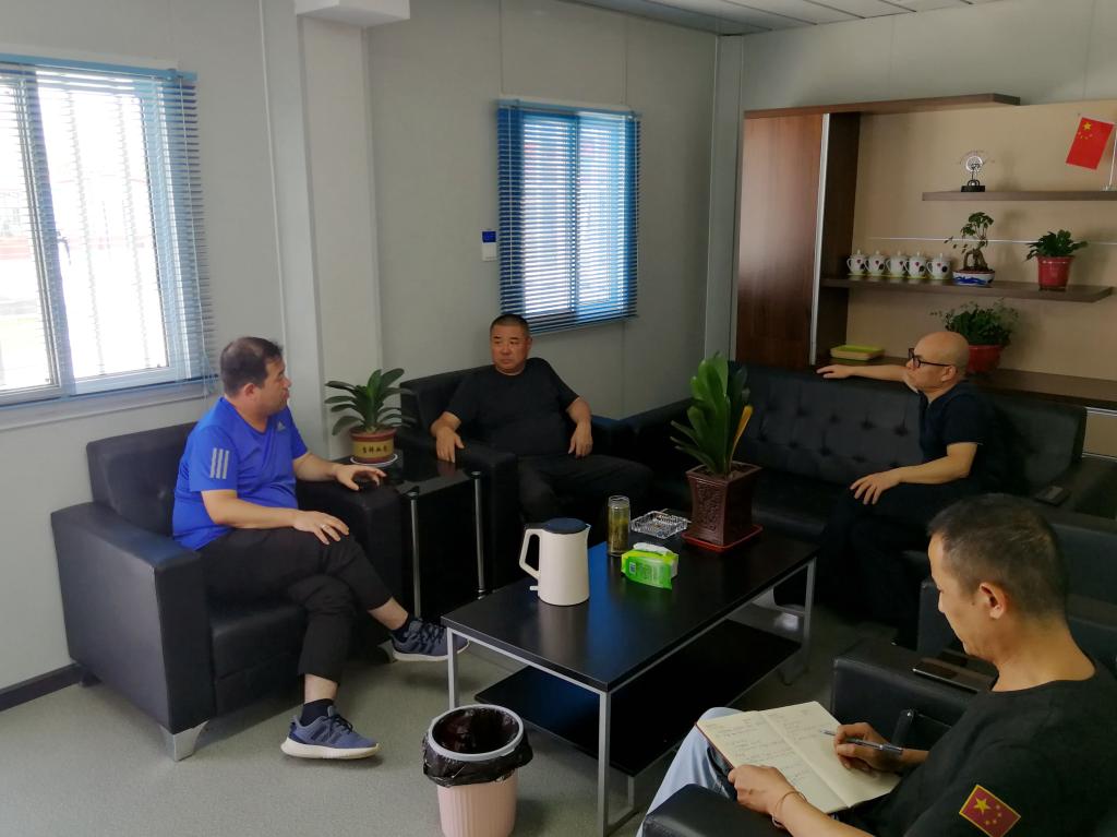 甘泽军(中)、王深宏(右一)与施工单位项目负责人座谈