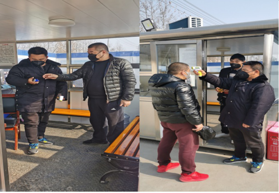 甘泽军检查体温计(左一) 同乘人员配合体温测量(右一)