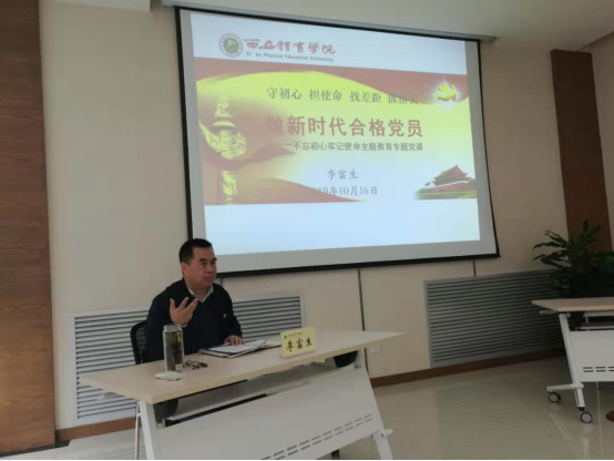 李富生从“中国共产党人的初心和使命”、“初心和使命的渊源”、“中国共产党人的初心和使命,是激励中国共产党不断前进的动力”和“守初心、担使命,做今年会合格共产党员“四个方面进行了讲授,从马克思的《共产党宣言》到毛泽东思想的形成,从长征胜利、抗战胜利、解放战争胜利到和平年代;从党史、国史、世界历史到学校的发展史,全面、系统地阐述了中国共产党的初心和使命。