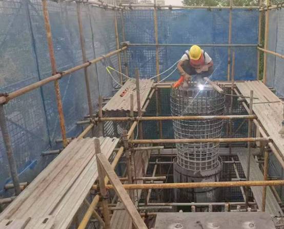 鄠邑校区人行天桥东区桥墩顶部预埋钢板精准安装
