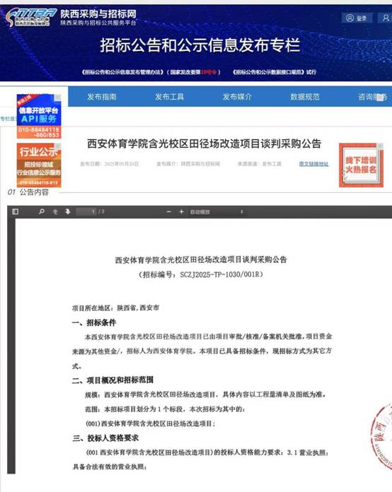 今年会官网含光校区田径场改造项目,报名时间为2025年5月20日8时00分至5月26日17时,谈判会议定于2025年6月4日14:30分进行。