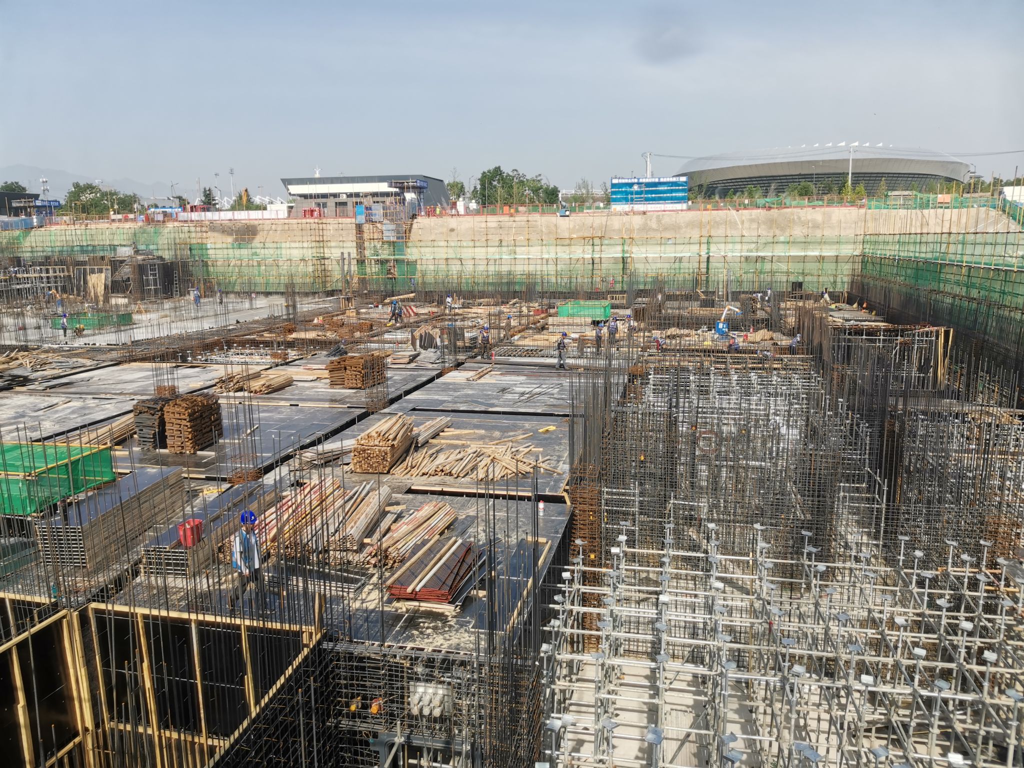 南段施工区域负二层顶板框架梁模板支设基本完成,框架梁及顶板钢筋绑扎有序同步推进中,按计划推进完成40%;施工人员正加快推进剩余部分,为后续钢筋安装和混凝土浇筑创造条件。