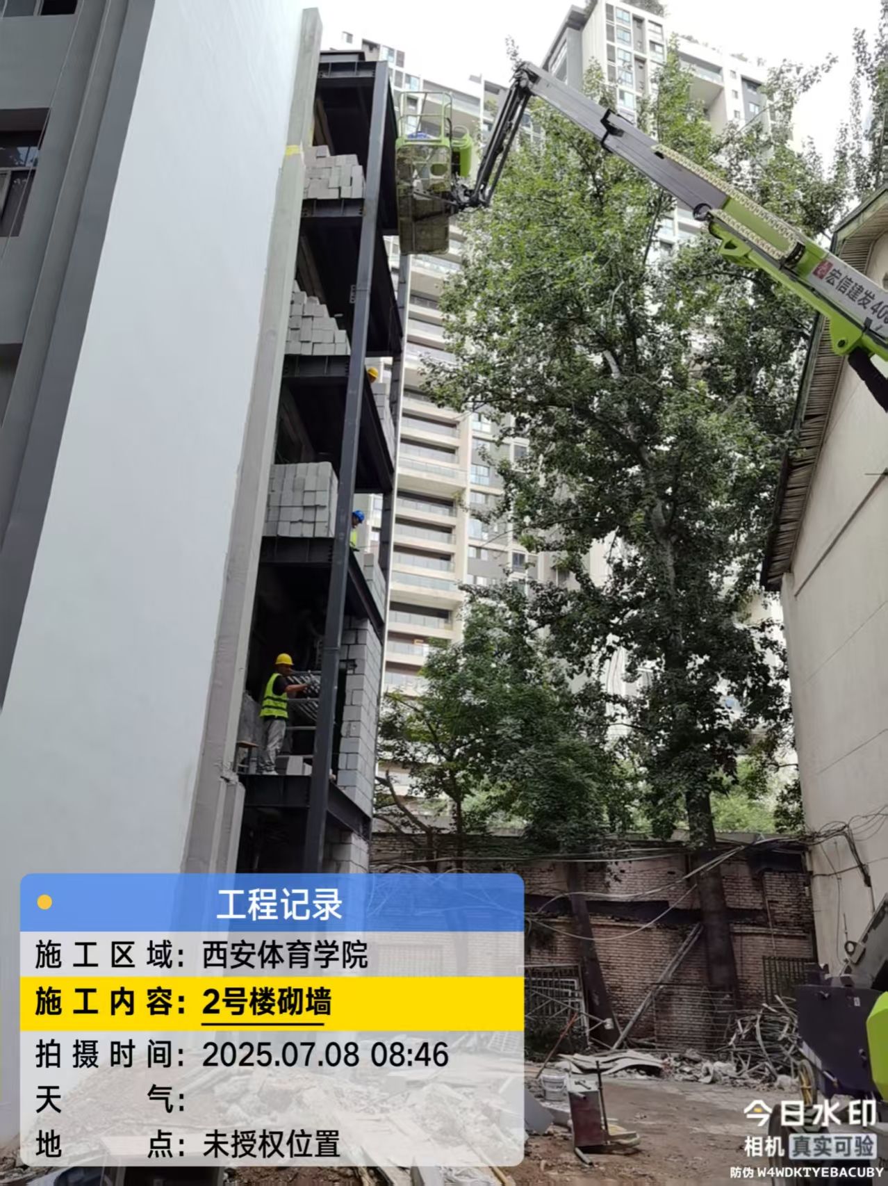 2号楼施工也在有序进行。工人借助高空设备,按照安全规范进行电梯钢结构砌墙作业,为后续施工打基础。行政楼与其他区域配合推进,各工序衔接顺畅,施工组织与质量安全管控到位。