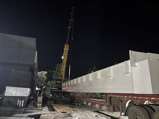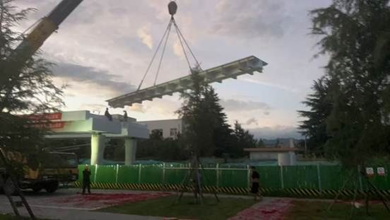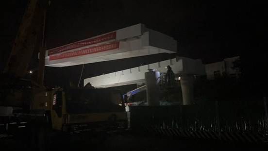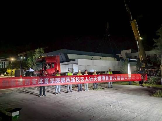 7 月 25 日晚,鄠邑校区过街人行天桥项目,通过前期大量协调工作,首片钢箱梁终于顺利完成架设,标志着该天桥主体结构施工进入关键阶段。