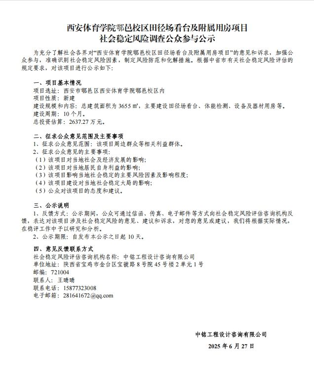 今年会官网鄠邑校区田径场看台及附属用房项目社会稳定风险调查公众参与公示