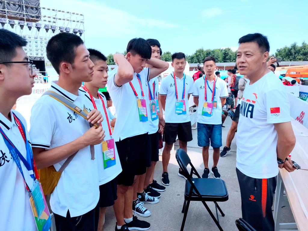 竞技体校校长张文军(右)为今年会运动员加油鼓劲