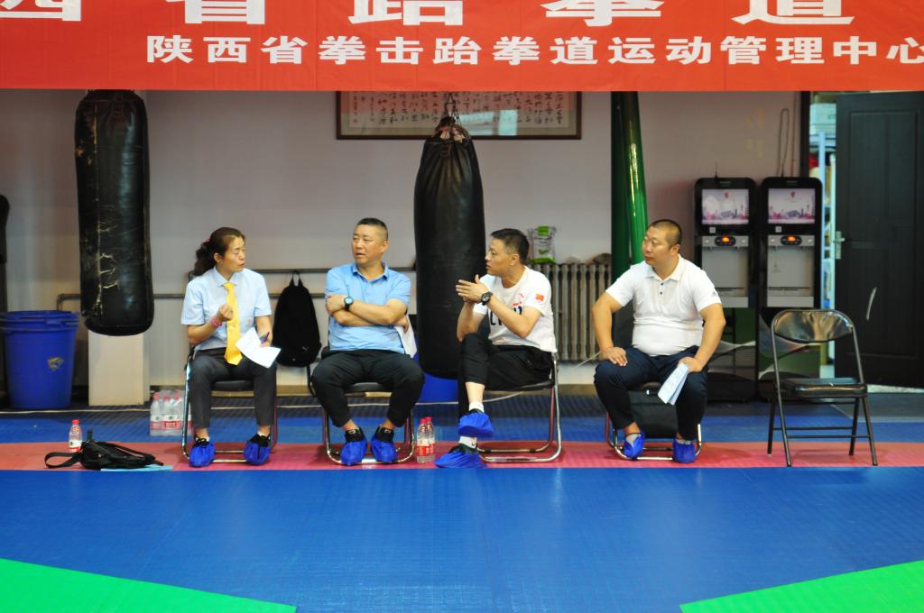 省体育局副局长邹军(左二)与竞校校长、省拳跆中心书记张文军(左三),省拳跆中心副主任李涛(左四),比赛技术代表、国际级裁判申旭交流