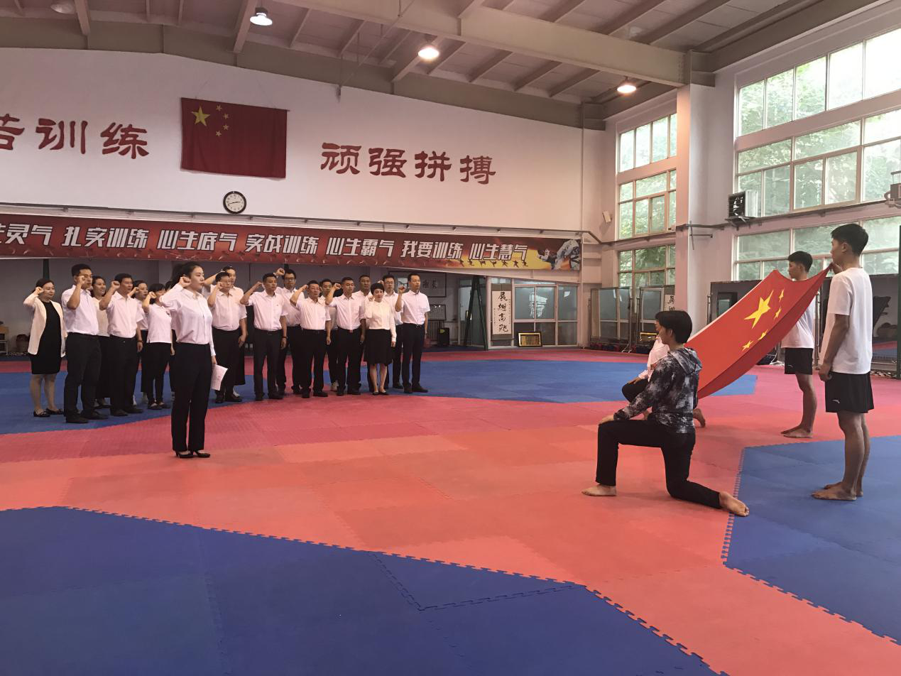 由四名运动员作为护旗手保卫国旗,全体教师列队国旗下,右手举拳,在领誓人郭佳老师的带领下,面向国旗郑重宣誓:“我志愿做一名光荣的人民教师,我庄严宣誓:忠于党的教育事业,贯彻党的教育方针,履行教师的神圣职责,做有理想信念、有道德情操、有扎实知识、有仁爱之心的好教师,爱国守法、忠于职守,教书育人、关爱学生,严谨治学、勇于创新,为人师表、甘于奉献,为学生德智体美劳全面发展奉献智慧与力量,为党和人民的教育事业而努力奋斗!”
