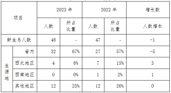 2.招生规模:2023年,学校共录取全日制新生47人,比2022年减少1人。按生源地分,新生生源地为省内:27人,省外20人。具体情况见下表: