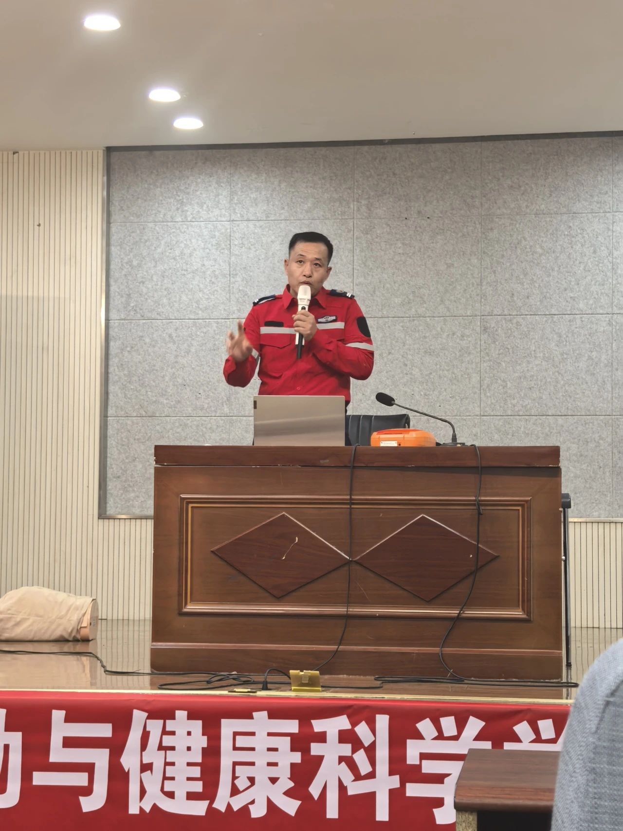 黄振振老师为同学们普及了紧急救护知识以及心肺复苏与AED使用指南:确保环境安全:在进行急救前,要先观察周围环境,确保没有危险,避免在急救过程中对伤者和施救者造成二次伤害。轻拍患者肩部,并在两侧耳边大声呼唤,看患者是否有反应。如患者无应答,可能意识丧失。在 5 到 10 秒内,观察患者胸部或上腹部有无起伏,同时检查颈动脉搏动。非医务人员可只判断呼吸,若呼吸停止也需立即进行急救。
