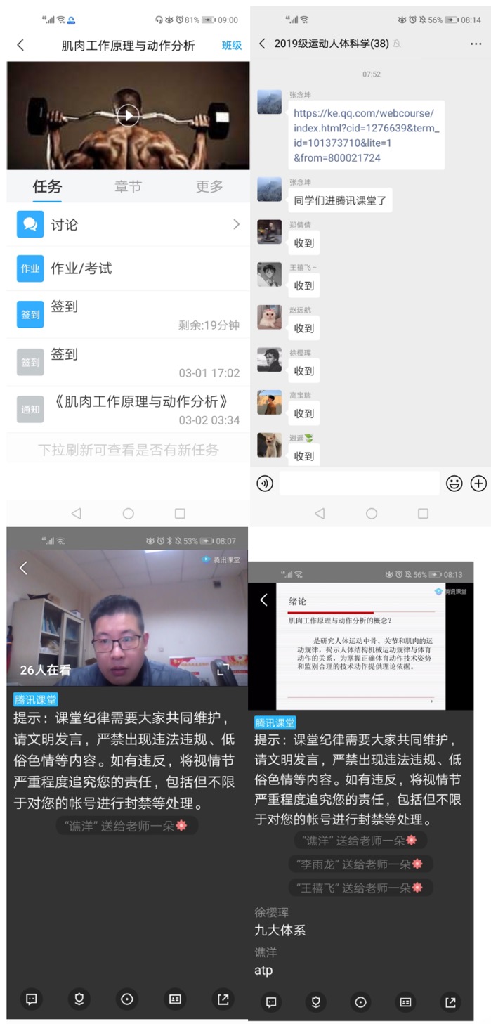 2020年3月2日是运动与健康科学学院师生网上开启开学第一课,此刻我们相约云端,隔空交流,虽身处不同地方,但心在一起,这既是对全院广大师生众志成城、打赢疫情防控阻击战的再检验,也是学院师生凝聚今年会精神、汇聚正力量,弘扬爱国奋斗精神的再出发。上课首日,不论是老师还是同学对于线上教学都是一个摸索阶段,但是我院教师和同学认真的态度,定可以打赢这场胜仗。也希望大家继续坚定信息,以坚实的步伐和乐观的心态期待明天,莫辜负这个伟大的时代,莫耽误宝贵的学习时光。