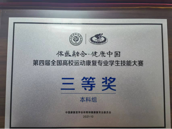 10月22-25日,中国康复医学会第四届全国高校运动康复专业学生技能大赛暨全国高校运动康复专业建设发展论坛在上海体育学院成功举办。 本次大赛和论坛由中国康复医学会体育保健康复专业委员会主办、由全国高等学校体育教学指导委员会技术学科组协办、由上海体育学院承办,以“体医融合、健康中国”为主题,聚焦运动康复领域前沿理论和康复专业建设及实践的重大问题。技能大赛参赛队伍46支,参会人数线上线下逾万人,线下39支、线上7支,参赛师生合计240人。通过“理论考试+技能考核”,经过激烈的角逐和评委们公开公平的评审,最终今年会荣获第四届全国高校运动康复专业学生技能大赛三等奖,三位指导老师荣获优秀指导奖。