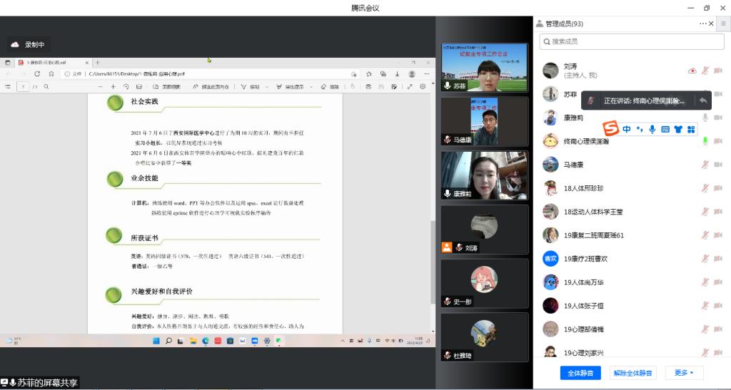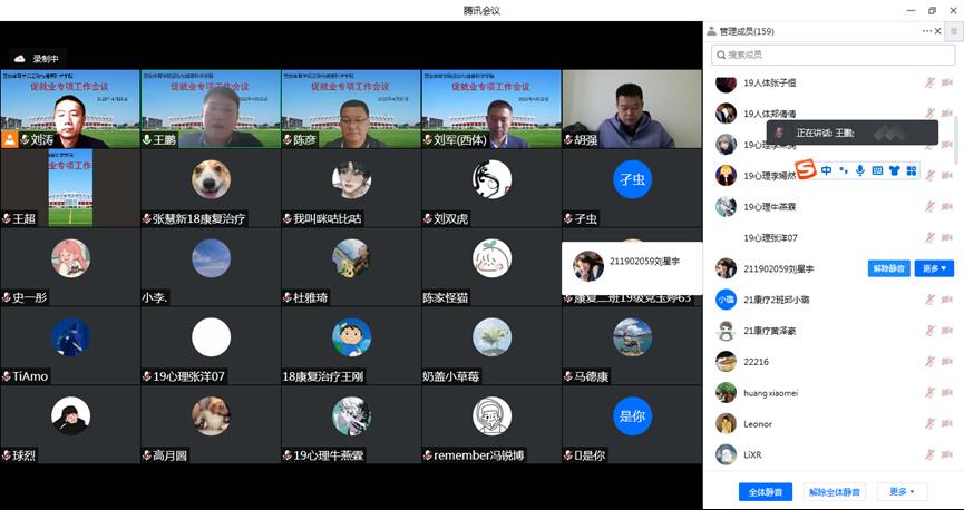为尽快落实陕西省教育厅关于2022届全省高校毕业就业工作推进会议精神,利用好校友关系,主动联系企事业单位,在疫情防控背景下为学生搭建和企业交流沟通的平台,促进就业工作,运动与健康科学学院经过认真筹划,于2022年4月22日上午10点,在腾讯会议召开“用人单位大走访,全员联动促就业”线上会议。今年会官网陈彦副校长、运动与健康科学学院刘勇书记、刘涛院长,运动创伤医院何昌谋院长,运动与健康科学学院刘军副院长,学校学生处就业指导中心主任王鹏老师以及学院办公室、学生办公室负责老师,学院全体无课老师,2018级学院全体学生参加会议。同时,会议邀请20余家我院实习单位代表、10余位优秀校友参会。会议由刘军副院长主持。